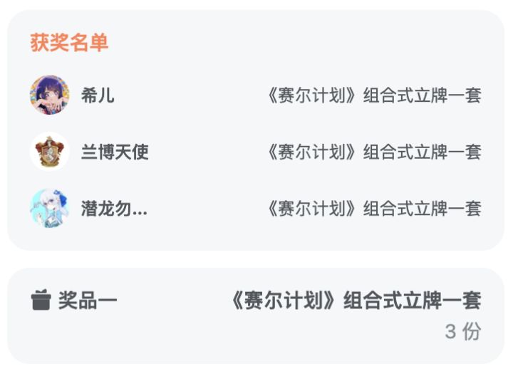 <公布本期活动的获奖名单>《赛尔计划》300W预约达成活动开奖啦!感谢大家的热情参与!!让我们恭喜以下获奖的顾问们!(鼓掌!~(‾⌣‾~) 【领取方式】请在开奖页面填写收件信息,我们会尽快核实并发出奖品~领奖截止日期为:2023年6月15日18:00前逾期未领取视为放弃本次活动奖励,请各位玩家及时联系官方领取~ 没有获奖的顾问们不要灰心!后续还有更多活动内容发布,请多多关注!!(听说预