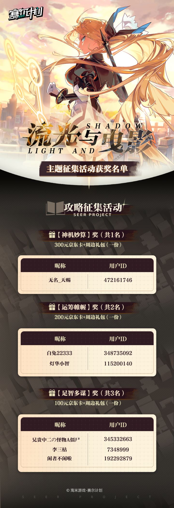 <公布本期活动的获奖名单>《赛尔计划》七夕节活动开奖啦!感谢大家的热情参与!!让我们恭喜以下获奖的顾问们!(鼓掌!~(‾⌣‾~)【领取方式】请以上玩家联系工作人员领奖并提供邮寄地址,加入QQ群901424599,备注为“论坛昵称+id号+赛尔计划TapTap平台七夕活动”我们会尽快核实并发出奖品~领奖截止日期为:2023年9月13日前逾期未领取视为放弃本次活动奖励,请各位玩家及时联系