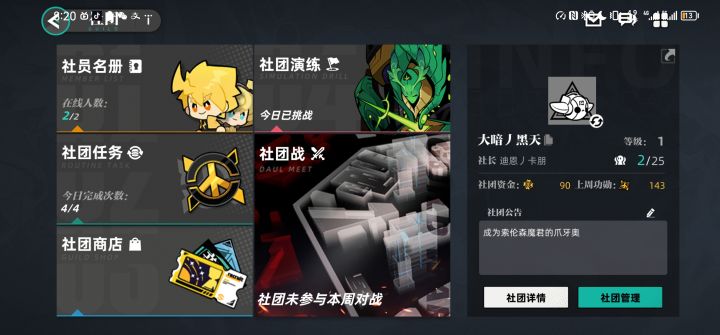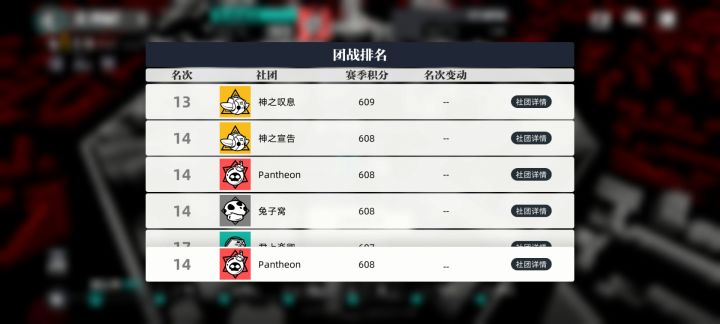 官服社团Pantheon目前6级,第一周社团战排名14,虽然应该没有排名这么强,但也基本属于第一梯队社团,暂时人满,不过毕竟开服退坑多,随时可能有空位。