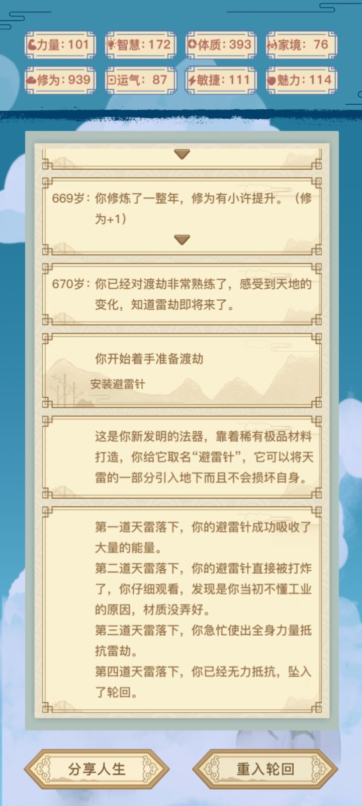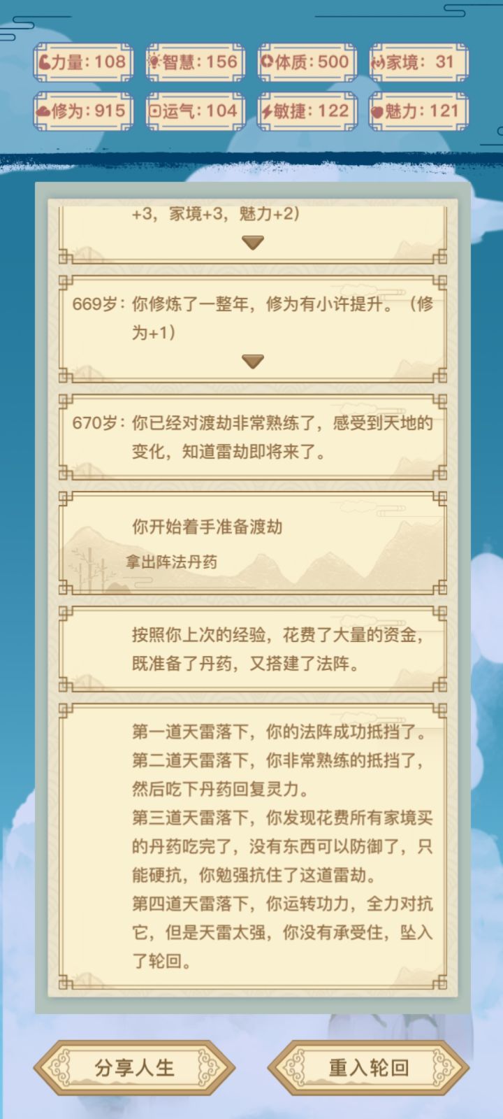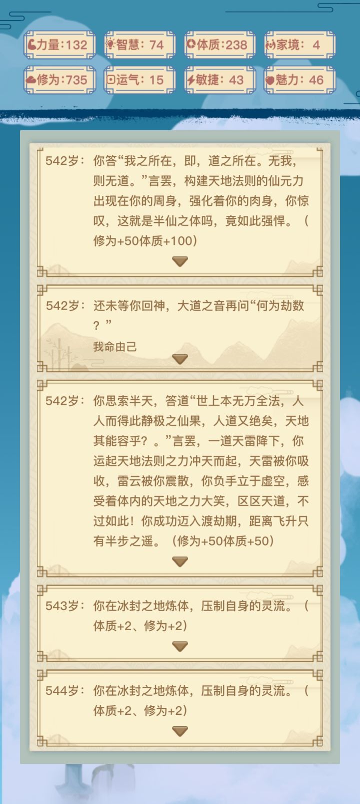 6.26补充一下:我发这个贴是因为我不知道怎么触发星茸幻境和无量仙府,所以希望能有道友告诉我。我把自己渡劫成功和失败时的属性值记录下来,仅供参考,准确的数值要求恐怕只有解包游戏才能得到。6.16第一道雷劫,选“在平原渡劫”,几乎必过。第二道雷劫,选“在海底渡劫”必死,选“在山洞渡劫”,要求体质≥400?第三道雷劫。两个选项吃丹药和布阵没有区别,要求体质,我495体质时被劈死了,498体质