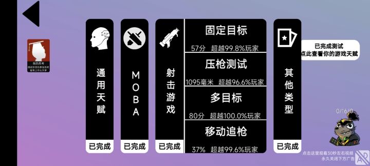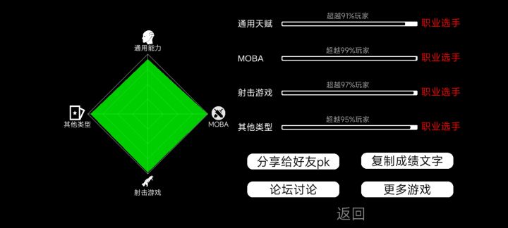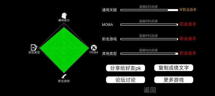 我在[我的游戏天赋]中的成绩: 通用能力超越68%玩家 -相当于主播代练 MOBA游戏超越88%玩家 -相当于半职业选手 射击游戏超越94%玩家 -相当于职业选手 其他类型超越73%玩家 -相当于半职业选手 你也来试试吧 https://www.taptap.com/app/223782