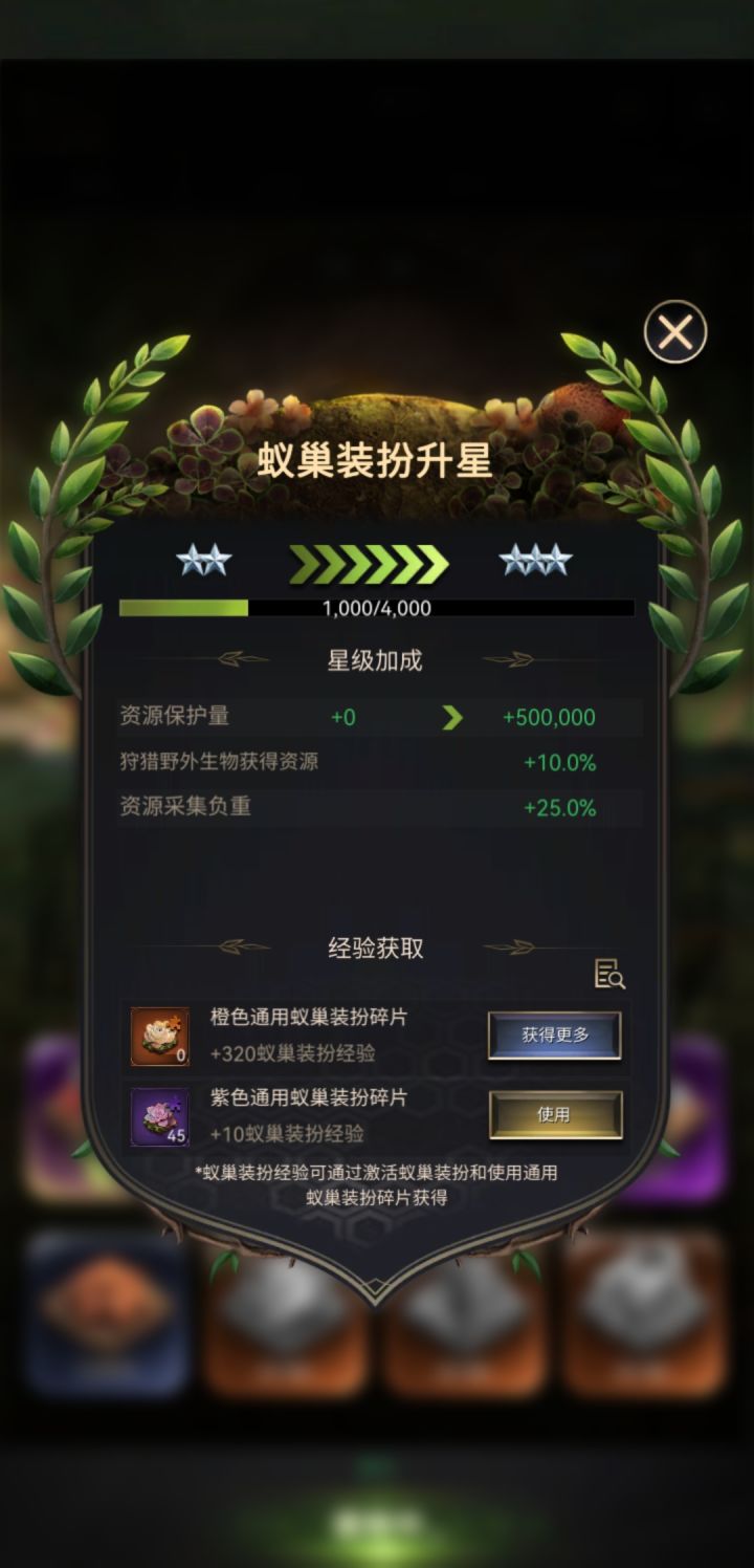 蚁巢装扮这个不同的有不同的特效加成,但是小小蚁国里卖的太贵,每周活动里做满也就给40碎片,想要凑够100碎片要么买,要么就是用,要么用紫色通用蚁巢装扮碎片替代!!!这里是重点!!! 在图3的使用那里点击使用凑够100就能激活永久装扮了,其实这是个简单的问题,但是这个游戏劝退率很高,玩一个月还稀里糊涂的大有人在,另外这个游戏氪度基础也高,所以能白嫖的就分享分享,因为攻略的确很少…… 对了,还有个