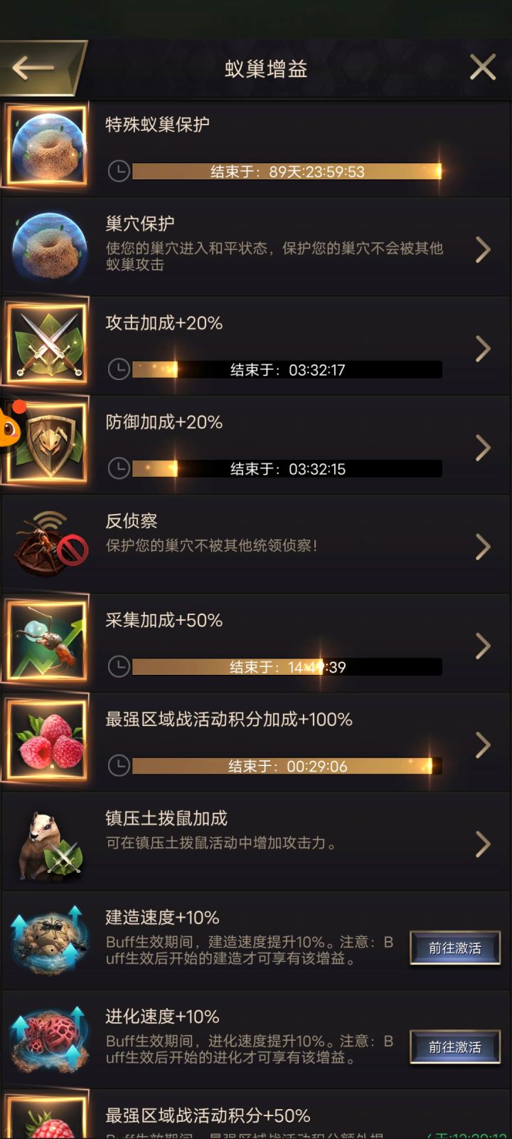 白嫖到25级已退游,分享下经验1.关于联盟:尽量选择没有内战的区域,比如说一家独大或者达成协议了的,内战不利于区战,可能拿不到奖励。2.升本:最主要先升到25,其它最多点进化的兵蚁等级,高协,和区域发展。升到25级以后区战赢了会获得一个橙蛋3.进化:尽快双倍奖励,那样会变成两个橙蛋。4习性:推荐采集那个,(假如你够安全,蜜露可以去瓢虫商店换,肉可以封了产蚂蚁那个,那样喂一次能够一周)5,