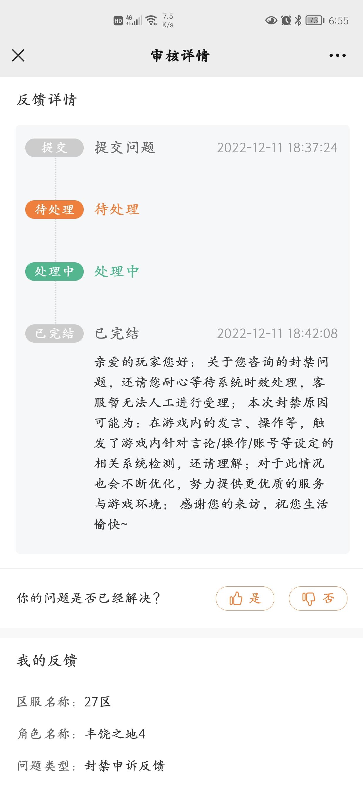 核实问题:账号封禁 服务器:27区 角色名:丰饶之地4角色ID:13778670登录账号:15848286121 登录端:华为为啥今天区域战被对面扫个田就被被封号啊,之前基本没打过人也没被人打过,希望蚁国gm大大们核实一下!~