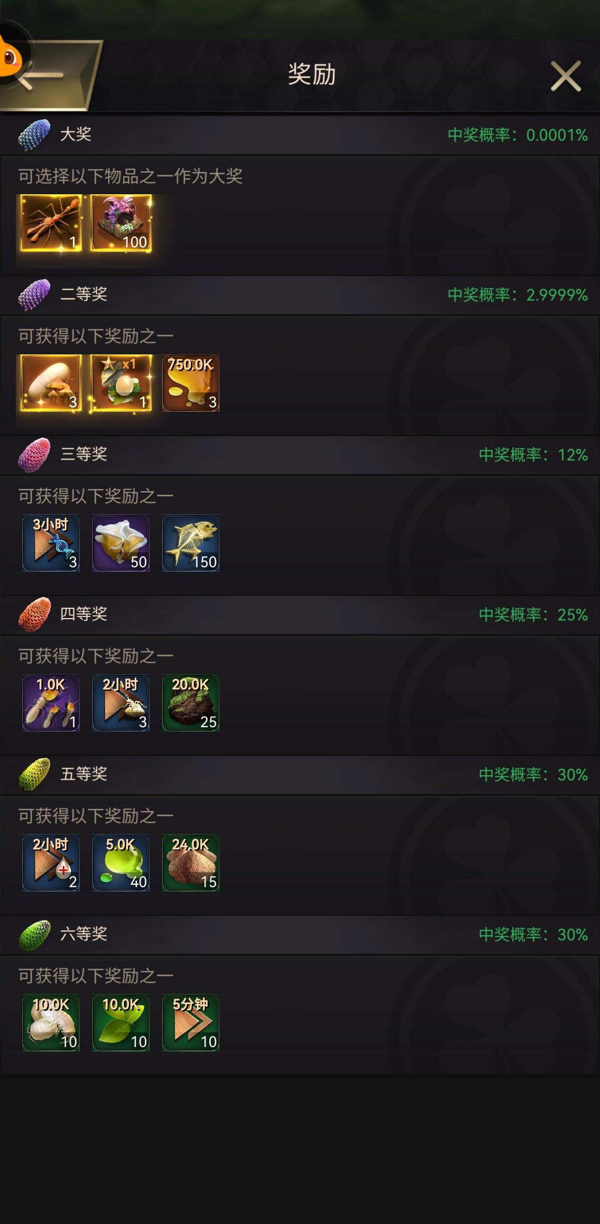 这中奖概率是不是太过分了?别的游戏最好奖励概率又有1~2%你这万分之一是不是太过分了?如果说只能靠抽奖抽到的话,活动时间五天全部礼包买完要39360元,总共也就2855次抽奖机会。也就是说5天花4万块不一定抽的到。虽然说万分之一不一定要一万次才能抽到,但同时的也有可能一万次也抽不到。还有比这游戏吃相难看的吗?除非后台有设置充了多少钱才能抽到,不然想都别想。最后只能是靠保底抽两百次和四百次拿到奖励。不充钱的五天只能抽20次想得二等奖想都不敢想,一等奖就更别说了。既然不充钱不可能获奖又何必出这种活动,直接把奖品打包成礼包,放到礼包商城卖不就好了。