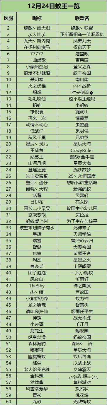 大家好,这里是正在被gank的放哨蚁!请求火力支援!请求火力支援!...身手敏捷的我又躲过一劫~现在还有点晕乎~但也要给大家带来12月24日的各区蚁王一览~~12月24日各区蚁王展示今天突然就被土坡鼠袭击,但我们一直也和平相处,放哨蚁实在是想不明白为什么土拨鼠突然骚动。12月24日各区蚁王展示在土拨鼠平静下来后,我终于了解到事情的原委。竟然是杀手蜂!杀手蜂群正在寻找新地点筑巢,然