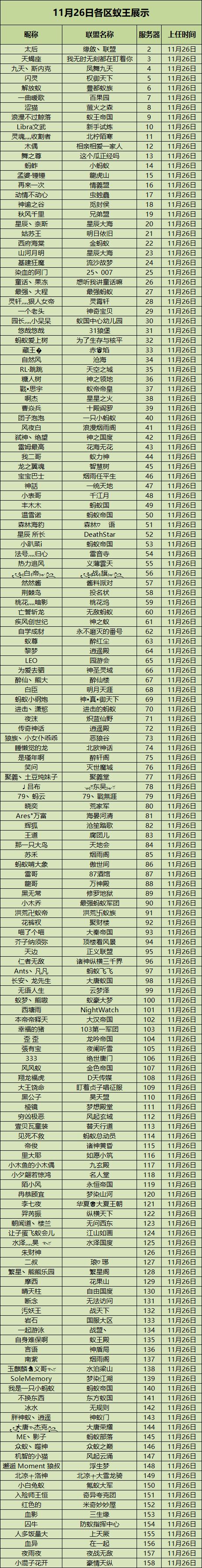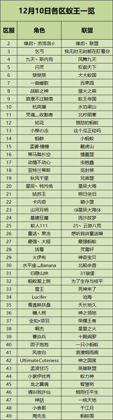 放哨蚁现正在艰难的前行..躺在沙地上看着一只螺在看想这只螺到底吸还是没吸于是!给大家带来了11月26日和12月3日的各区蚁王给大家~~11月26日各区蚁王展示自第一次公示各区蚁王开始,纷纷就有不少统领给放哨蚁留言诉苦,放哨蚁后何尝不知道各位领主的痛呢。但,在最近的一次更新中有提到过即将开放区域迁徙功能,这无疑是给各位统领一次团聚的力量!12月3日各区蚁王展示在区域迁徙活动开始后(