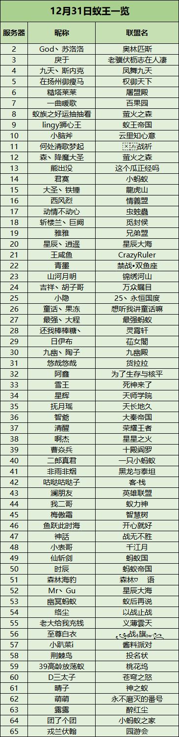 大家好,这里是放哨蚁。祝各位统领在新的一年里事事顺心!同时放哨蚁给大家带来12月31日的各区蚁王一览~~12月31日各区蚁王展示说起新年,我们蚂蚁也有属于蚁界的新年~那就是,我们的蜜露狂欢~(绝对不是我胡说)12月31日各区蚁王展示那年春天,放哨蚁我呀,迷迷糊糊的走进了一个很大的洞穴里。走出重重迷雾后发现,竟然有用之不竭的蜜露湖泊!新年要开开心心~我当时肯定就直接开炫了呀老铁!