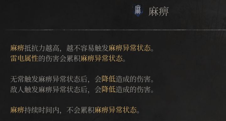 我们来介绍一下《明末:渊虚之羽》中的各种负面状态:麻痹:雷电属性伤害会积累麻痹异常状态,麻痹的无常或者敌人会降低造成的伤害。对应方法:穿戴雷电属性防御力高的装备使用【避雷丸】,提升自身闪电减伤率腐化:无常和敌人处于腐化状态会持续受到伤害。对应方法:穿戴腐化属性防御力高的装备或使用消耗品【紫山茶】可以清除腐化累积,解除腐化状态消除失心:触发失心状态的敌人和无常会直接死亡。对应方法:穿戴失心属性防