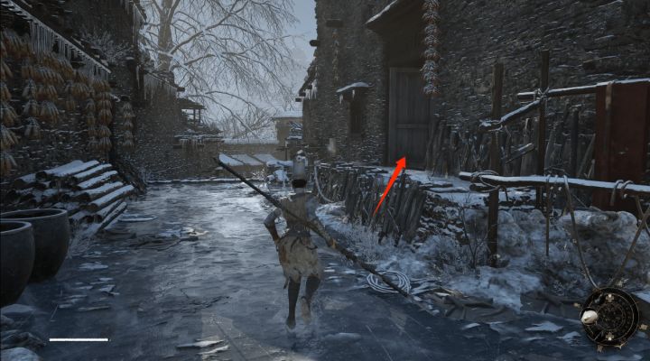雪堡主堡神龛处入梦后左边这排房屋圆圈区域拾取【绿莲子*3】,拾取后前方左转箭头区域往前走有笋精,获得【竹笋*1】后这片区域就没什么好探索的内容了,回头出来走左侧向上可以探索主堡二楼,上台阶后我们先走左侧箭头处,末端拾取【羽珠*1】,随后回到台阶平台走右侧箭头进入雪堡。左侧门和正面其实是连通的,这里直走正面推门进入,门内拾取【蒸面兔*2】,前方击败两名敌人左侧箭头处拾取【结晶的赤汞*1】,
