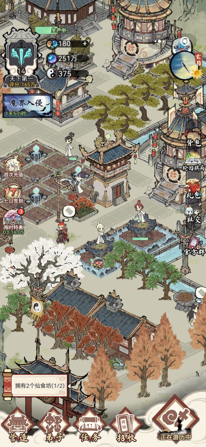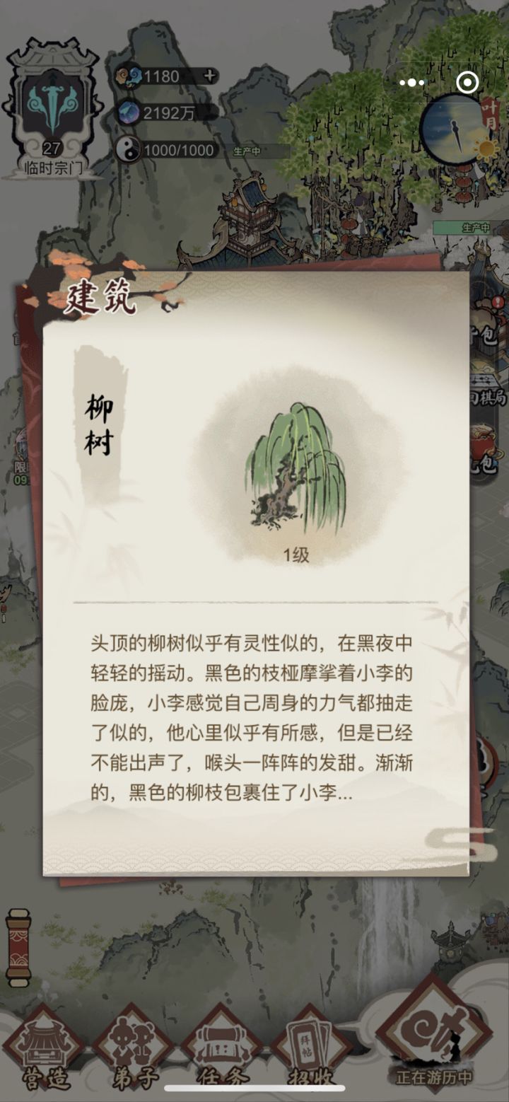 一群弟子老是抱怨路不通,我找了半天没找到,今天忽然发现,该不会是门口这棵柳树吧,把它挪走之后,可不是嘛,修仙弟子下山被柳树堵住了如图,门口这个位置有一个格子,可以放东西,当时放柳树是因为柳树的描述阴森恐怖,正好看门放上之后可以看天财阁,天财阁的弟子下不了山,就积攒不了晶石,里面一直空的,原先我以为是更新后不需要手动采集了…