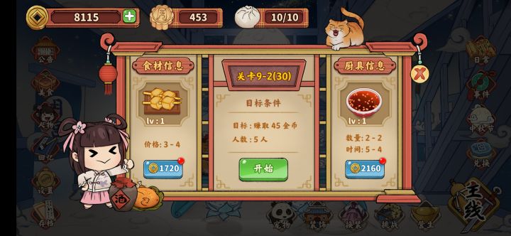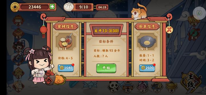 主线关卡9钵钵鸡所需金币:64960食材升级22次,第一次1720,每次递增20,第22次2140,总共42460金币厨具升级10次,第一次2160,每次递增20,第10次2340,总共22500金币