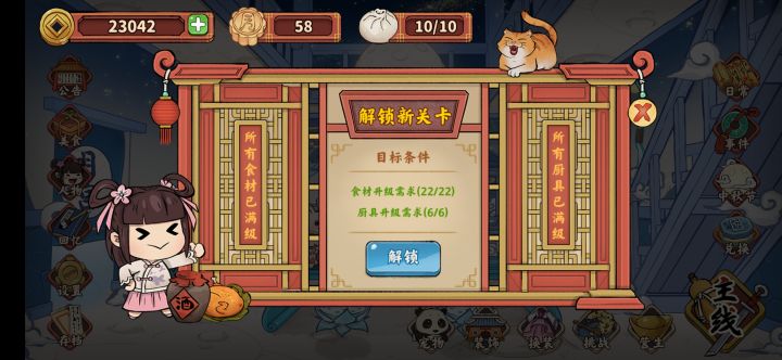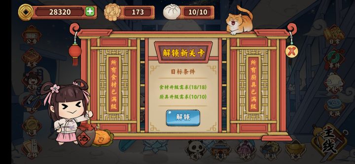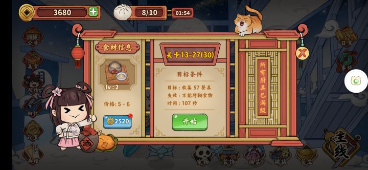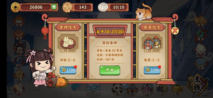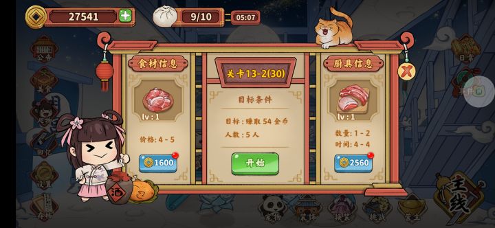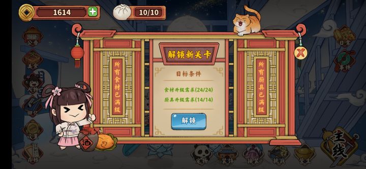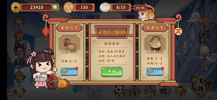 主线10竹筒饭升级所需金币70700食材升级18次,第一次需金币1850,每次递增50,第18次需金币2700,总共需金币40950厨具升级10次,第一次需金币2750,每次递增50,第10次需金币3200,总共需金币29750
