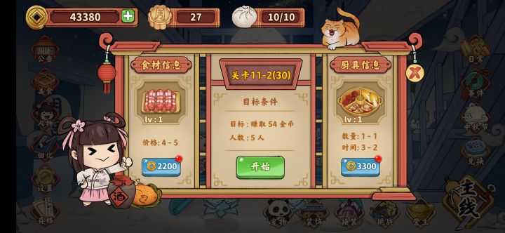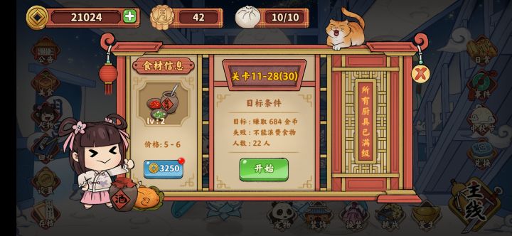 主线11 火锅 所需金币80500食材升级22次,第一次需金币2200,每次递增50,第22次需金币3250,共需金币59950厨具升级6次,第一次需金币3300,每次递增50,第6次需金币3550,共需金币20550