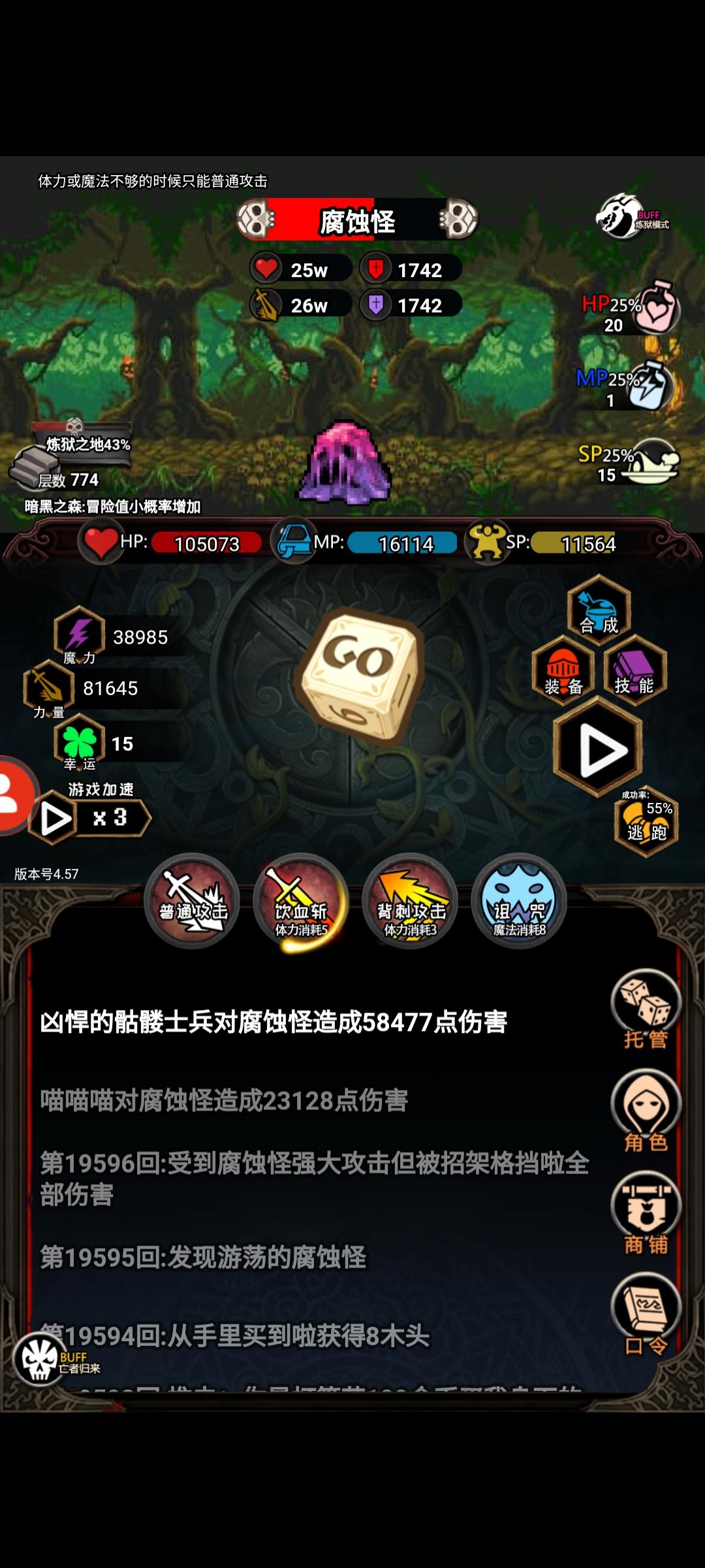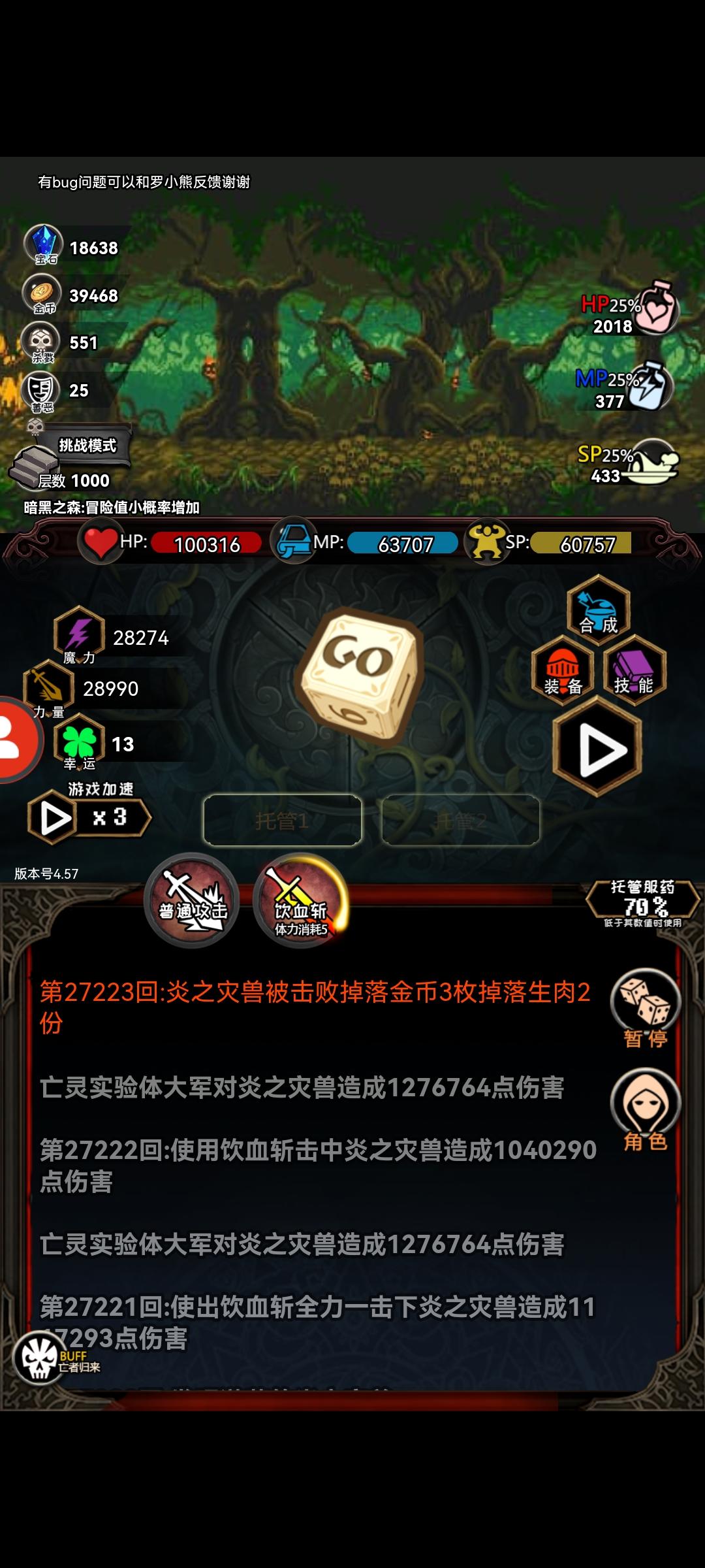 刚刚发现一个bug,源自于我的误触,我当时在打楼层boss我史莱姆之王,开了托管70%血量,带蓝领套装,带魔晶法套,还有真天庭宙斯号,宠物是大圣7幸运。boss打我就是刮痧。然后我误触了逃跑。满血的我触发了亡者归来剩了1血(我炼金,背包还有自然宝石、自然符文也没有回血)那一瞬间我是错愕的(而且托管并没有给我喝血瓶。)然后没有关的托管行动给我再次行动了一轮。我死了,后面再试了一次,确实是boss战的逃跑按钮会触发这个bug。
