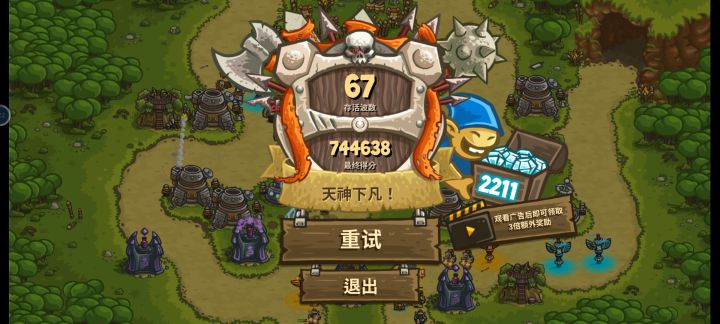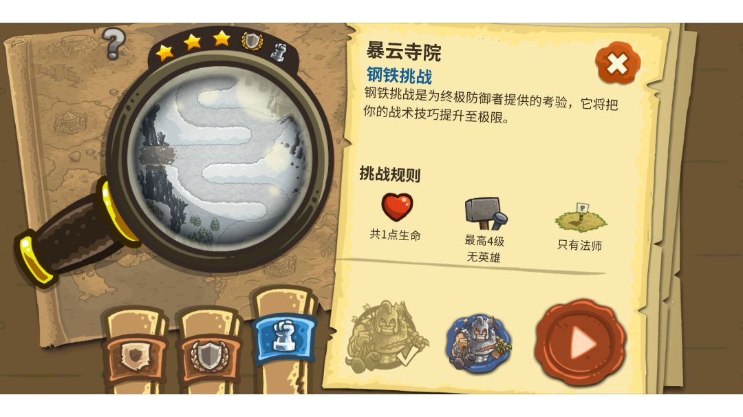 这次顺序打错了,先打钢铁挑战了。不过问题不大,不加那个兵营的点,英雄挑战也可以过。 堆魔法塔就完事。