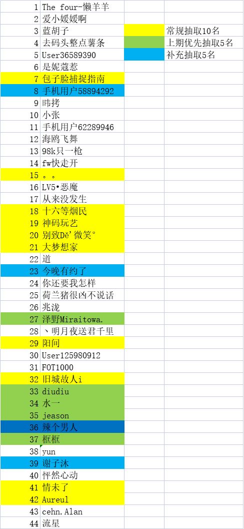 首先,祝各位支持我们的玩家新年快乐!然后,要对各位玩家说声抱歉,因为前段时间的工作比较繁忙,论坛的事情一下子耽误了不少。接下来将会继续跟进更新,感谢大家的支持!下面就公布12.12到1.21这段时间的三轮奖励名单。黄色为本期随机抽取的10名玩家,蓝色为延期补偿抽取的玩家,绿色为上期为中奖优先抽取的玩家。以上玩家将获得我们的优先测试资格。接下来的更新将会继续按照计划推进,过年期间将会为各位