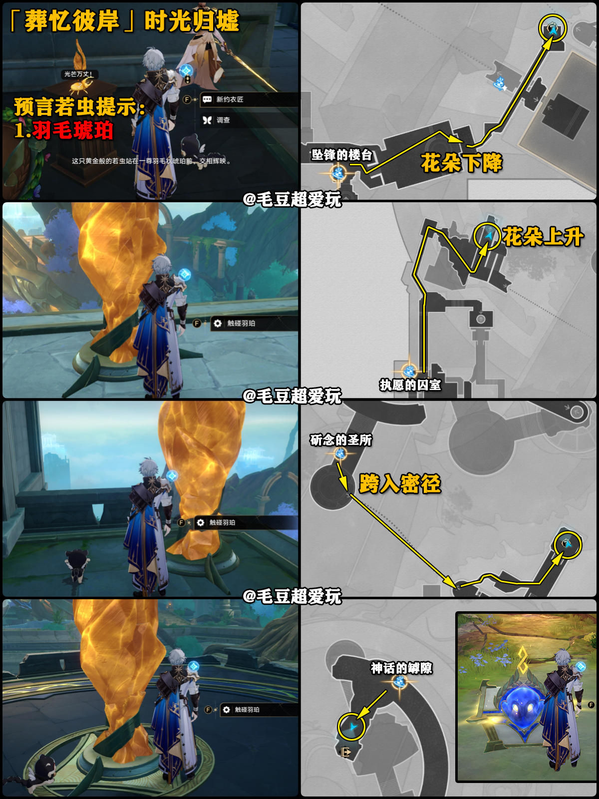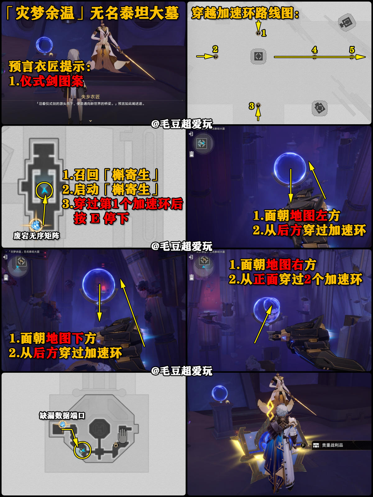 【崩坏:星穹铁道】UID:102444222全篇共计包含:🌟预言宝箱*2🌟星琼*60🌟无序秘酿*120「灾梦余温」:预言提示:仪式剑图案。前往废岩无序矩阵传送点,召回并启动槲寄生,根据下图路线操作槲寄生穿过5个加速环,操作槲寄生时按下左上角的退出按钮,可以打开垂直反转方便操作。「葬忆彼岸」:预言提示:羽毛琥珀。跟随图中路线触碰点亮3个羽珀即可。#成为昨日的明天 #其他攻略#解谜探索