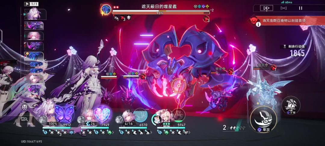UID:100148671这期为各位带来3.7版本最新的「末日幻影·螟蝗煽动」满星攻略,碎星王虫与幻胧都是老敌人了,可能部分小伙伴已经忘记机制了,这次就来复习一下机制细节。此外还有相关优势队伍推荐,减少你的试错次数~一、环境效果击破敌方弱点后,我方全体解除控制状态、立即行动、回复生命值。由于碎星王虫控制频繁,不能完全指望环境效果救你,依旧推荐搭配主动解控/免控类型角色。立即行动则是本期的关键