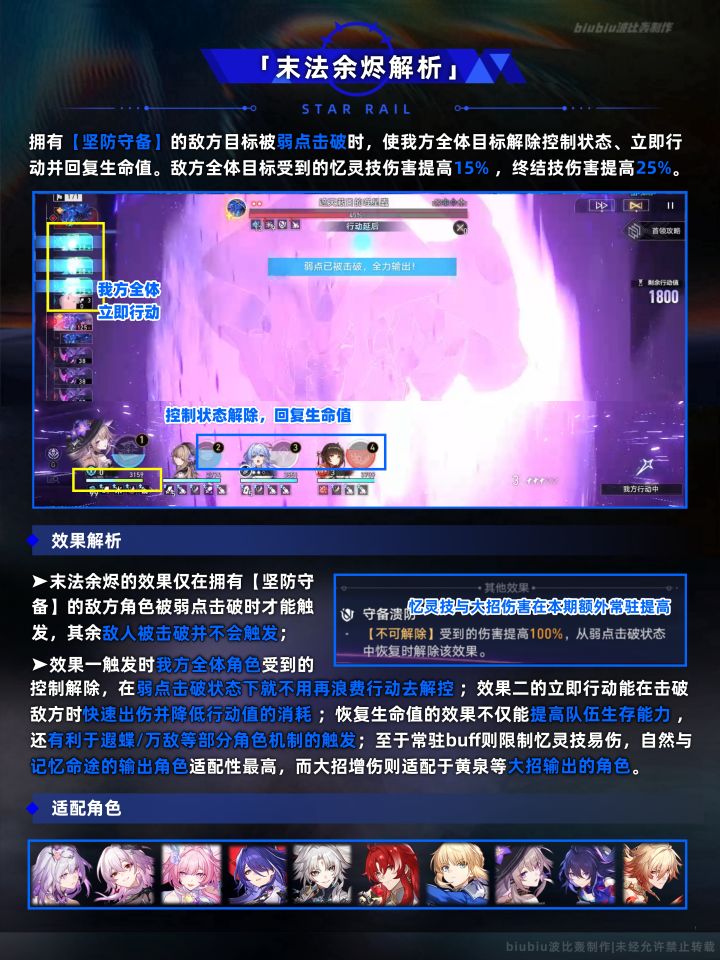 3.7版本末日幻影更新了,平民玩家,该如何拿满800星琼?哈喽喽,大家好啊,这里是拾柒的崩铁时间!· 本期末日buff环境还是老规矩,咱们先看这期末日幻影的buff效果,其实也不难,当boss被弱点击破后,就会给我方回复满血量,净化全部负面效果以及全队拉条。只可惜没有回复满能量,效果差了点,不过,这生命回复效果,对遐蝶来说,简直就是绝配,相当于直接激活终结技,白送一条龙!· 本期末日镇守