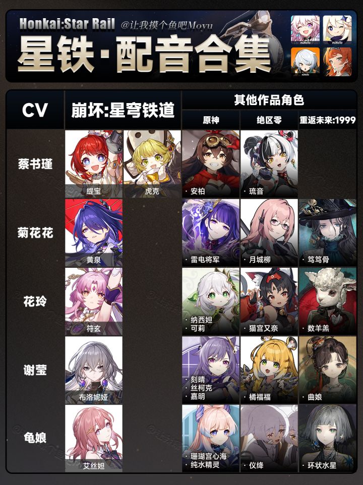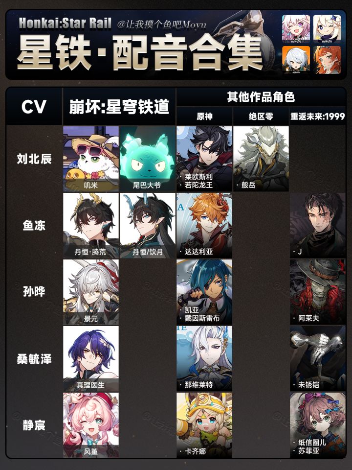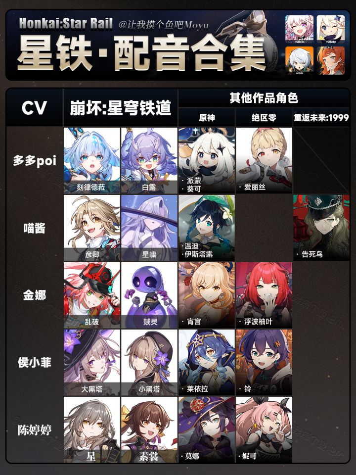 UID:104347362将将!摸鱼来啦!星穹铁道角色中文cv配音表——更新至3.7版本对比「原神+绝区零+重返未来:1999」有你特别喜欢或感到意外的cv吗!!!可能有漏掉或者不确定的,欢迎大家补充噢(听劝)以后会继续更新嘟!—————— ฅ՞• •՞ฅ ———————觉得有用的话一定要💗👍鱼酱哦!好了,以上就是本期的全部内容。溜~🔘创作不易,严禁任何商业性转载及搬运🔘制作