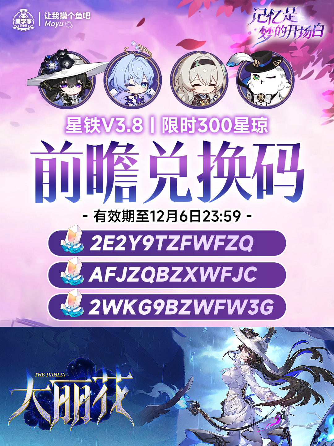 UID:1043473623.8的前瞻直播大家都看了吗? Moyu帮大家整理汇总了所有信息!另外别忘了兑换码哦:2E2Y9TZFWFZQAFJZQBZXWFJC2WKG9BZWFW3G⏰有效期至12月6日24:00前—————— ฅ՞• •՞ฅ ——————— 觉得有用的话一定要支持摸鱼酱💓哦!好了,以上就是本期的全部内容!#崩坏星穹铁道 #崩坏星穹铁道创作者激励计划 #崩坏