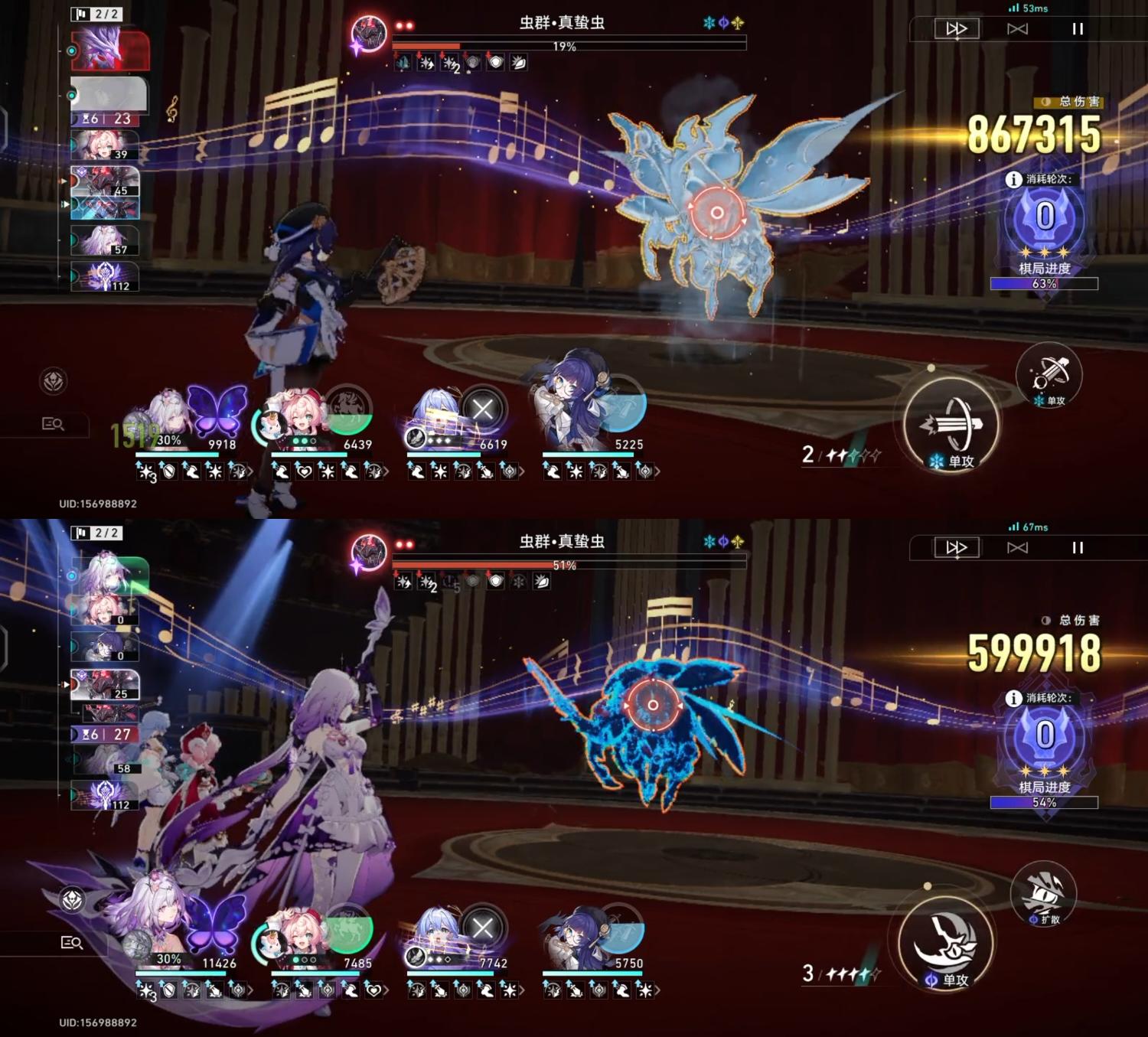淬火这个debuff,直接把拉踩二字怼玩家脸上。敌方目标生命值每降低1%,我方对其造成的暴击伤害降低3%,对于我这个暴击厨来说,如梗在喉。于是我尝试刷一套几乎没有暴击词条的遗器去看一下啥效果。如图三,结果令我大失所望。我只打了一次,可能存在不小偏差。但均为满拐状态,行动值也是差不多的时候。可惜死龙吃不到量子套的减防,不然的话可以齐平甚至反超。 即便我尽可能的压低了暴击率,但实战中仍打出了数量不少