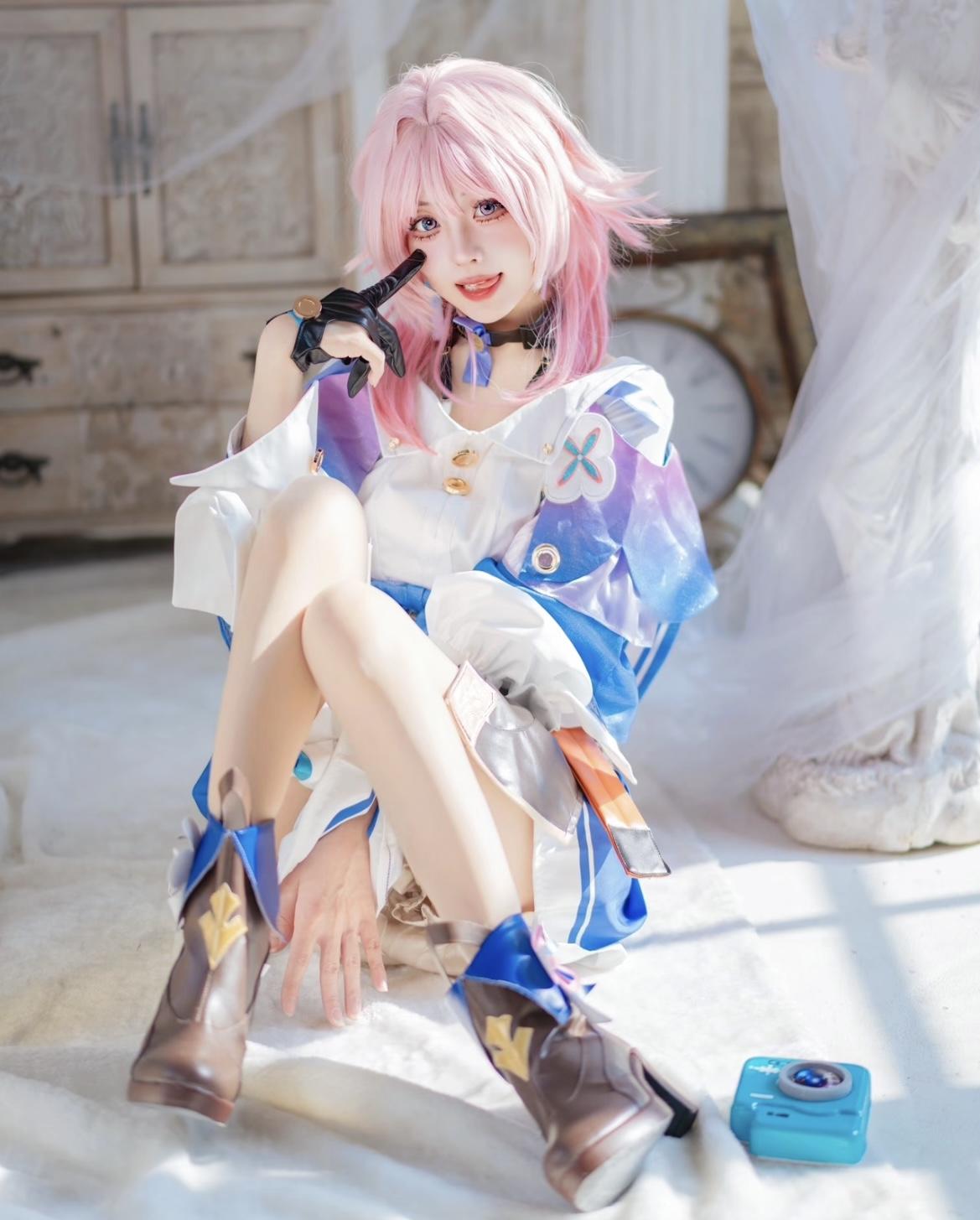uid:100512025这组三月七的cos正片直接把角色的元气与俏皮刻进了骨子里!造型上,粉粉嫩嫩的短发蓬松又有层次感,发丝的弧度完美还原了三月七的灵动,服饰的还原度更是让人眼前一亮,白蓝紫的配色精准复刻角色造型,布料的褶皱与装饰的金属扣、徽章都精致到细节,棕色的靴子搭配蓝色绑带,既贴合角色的穿搭风格,又让整体造型更显活泼。一旁的蓝色相机道具更是点睛之笔,瞬间拉满三月七“拍照达人”的角色特质。