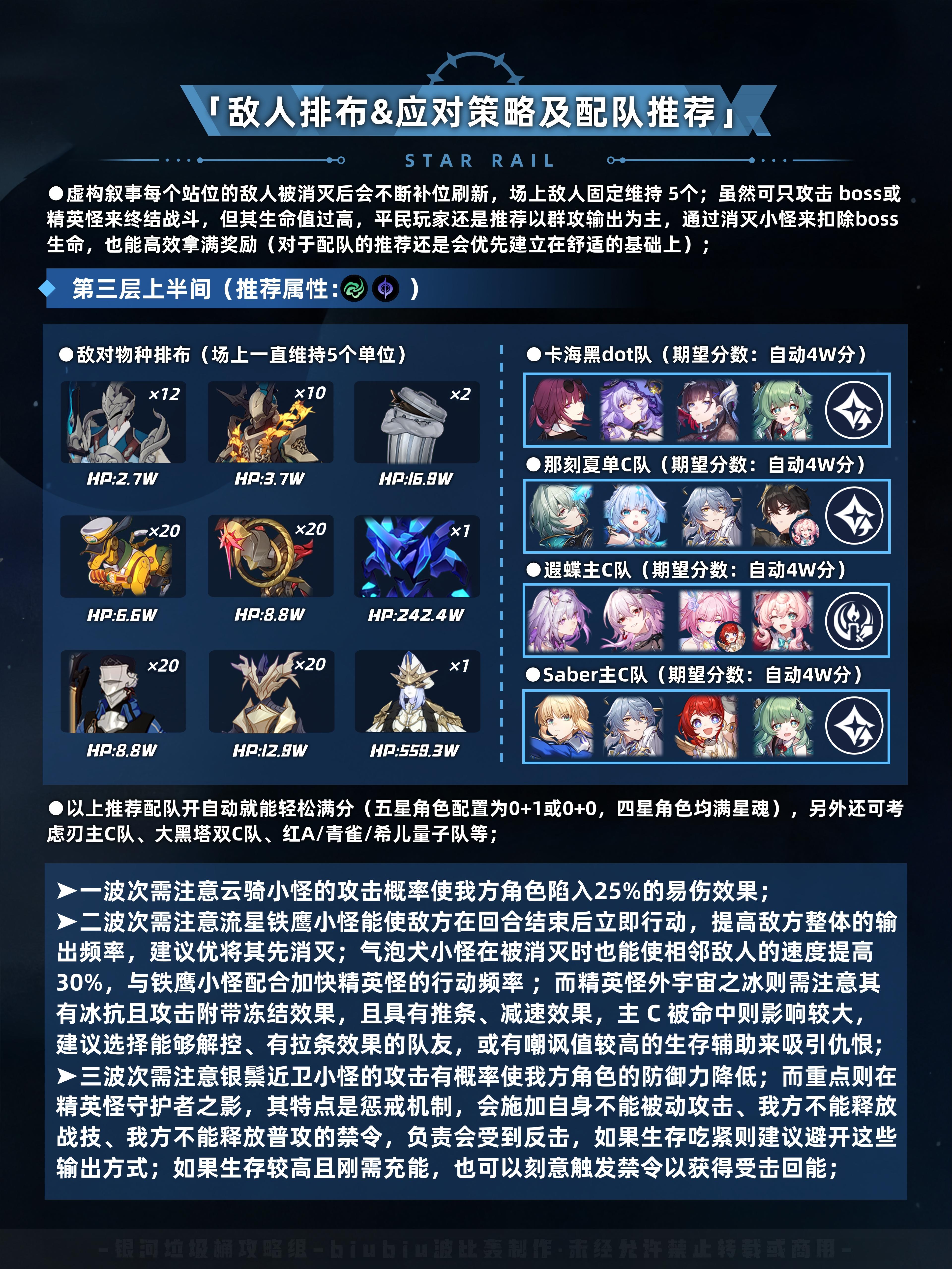 UID:101667549本期虚构叙事综合难度有所降低,能够拿满奖励的配队还是很多的,其中遐蝶队与有了大丽花的击破队本期在上下间很容易就能取得高分(队伍练度及队友完善甚至能自动满分);至于本期大buff则主要利好群攻类战技输出角色;小buff则涵盖战技、击破、忆灵三个方面,泛用性还凑合;敌对物种则大多都是往期遇到过的,因此应对起来也比较容易;总体来说本期虚构叙事的水温适中,三四层敌方总血量相较