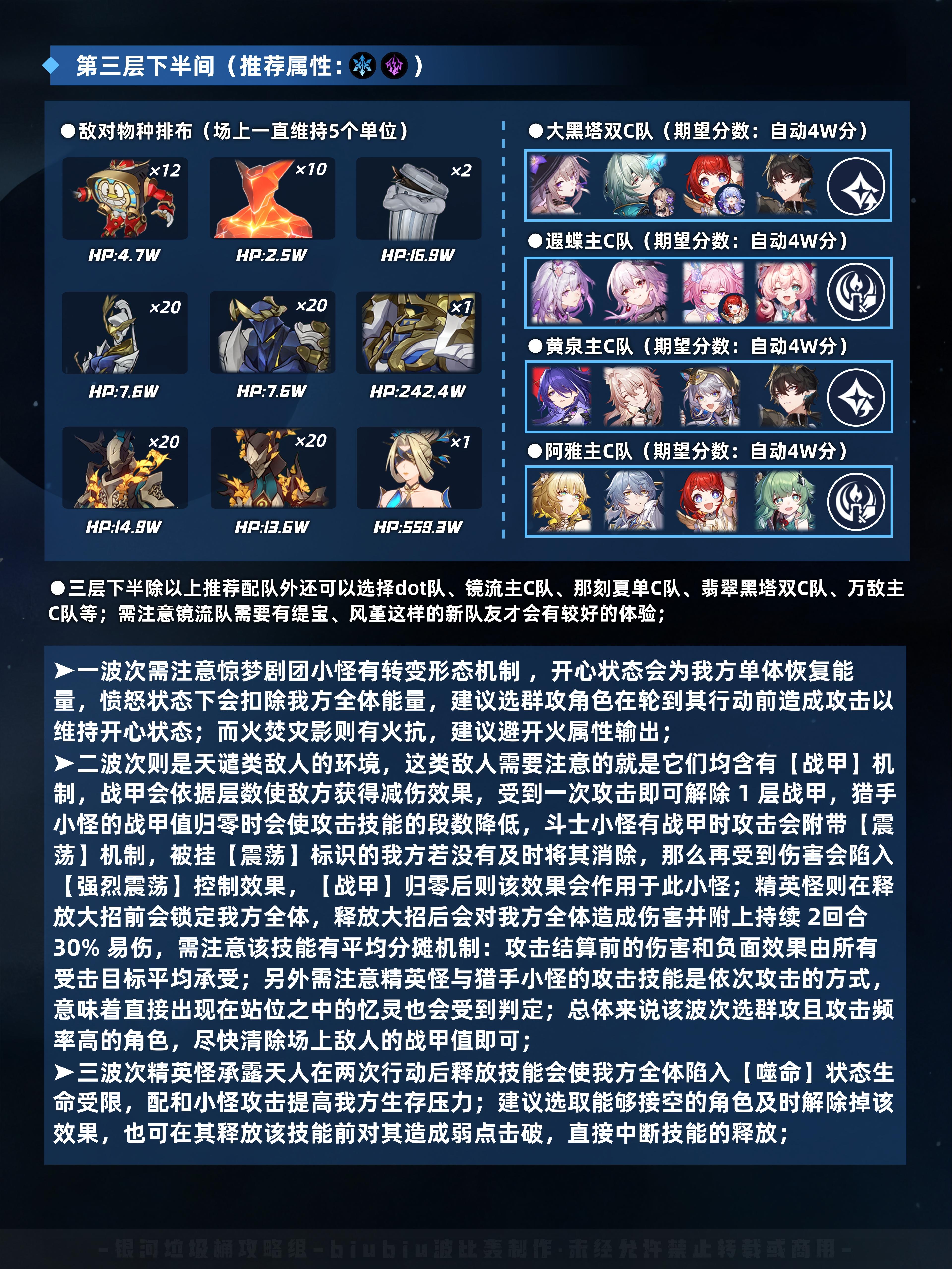 UID:122142513📝三上下都很容易满分通过,四上下目前只有这一套是可以的,如果有开拓者的流萤可以组完全体队伍可以试试四上,要是还有其他可以自动过的阵容也欢迎大家分享在评论区供其他开拓者尝试📝第三关上半【遐蝶 昔涟 风堇 记忆主 】【刃 星期日 阮梅 罗刹 】【那刻夏 刻律 阮梅 记忆主】 第三关下半【大黑塔 小黑塔 停云 腾荒】【那刻夏 大黑塔 缇宝 腾荒】【大黑塔 小