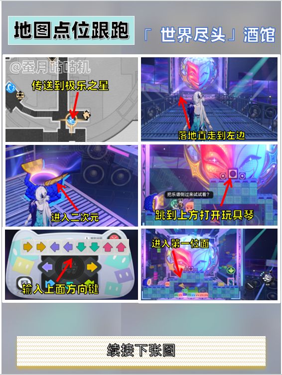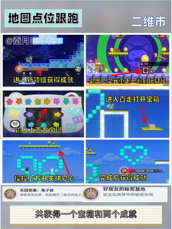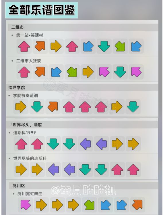 UID:122142513🌱除了已有的一个乐谱,剩余5个乐谱全部在图2,可以自行查缺补漏。🌱跑图特别说明『二维市』就是需要多次重进重出,『鸽川区』最后按钮三下爆破获得成就后再按一下有大量像素金币,『世界尽头·酒馆』进入后总共6个位面,记住方块消失出现顺序规划好怎么跳再跳跃比较顺利些,第四位面到达二层平台处直接三连跳容易到上方三个方块处。以上就是这次二相乐园玩具琴可演奏的全部乐