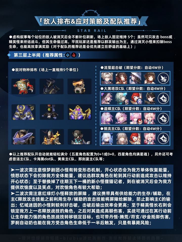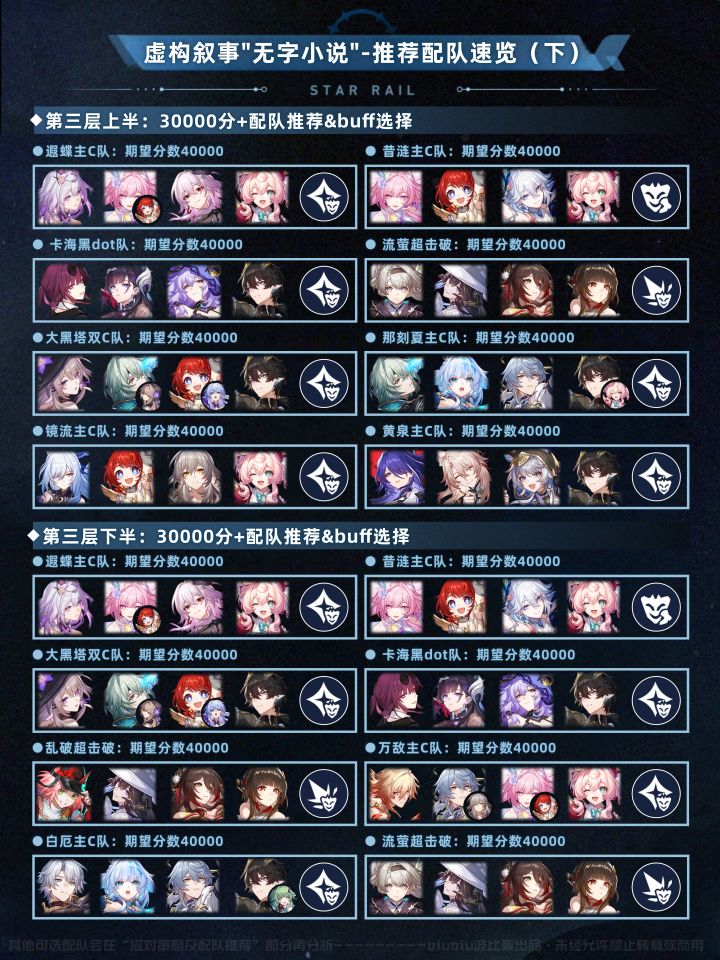 UID:101667549本期虚构叙事综合难度较低,能够拿满奖励的配队比较多,其中遐蝶记忆队、卡海黑dot队、主C+爻光欢愉队、流萤/乱破超击破等配队本期在上下间很容易就能取得高分(队伍练度及队友完善甚至能自动拿满分);至于本期大buff则主要利好欢愉命途的角色;小buff则涵盖欢愉增伤、阿哈提速、增伤、击破增伤等多个方面,泛用性还凑合;另外得益于本期buff,常规的配队中带上爻光可能会取得更高