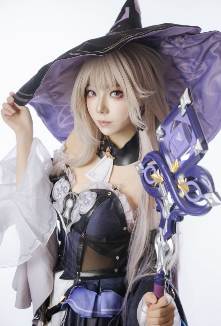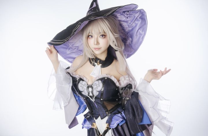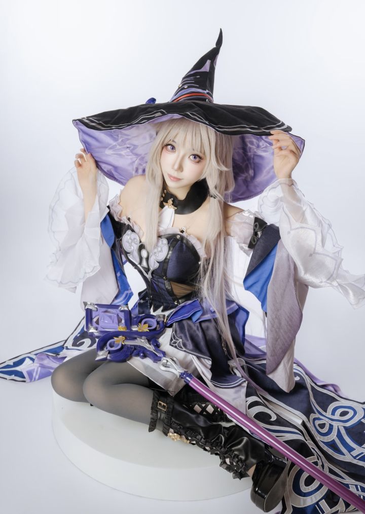uid:100512025这组丽莎cos完美诠释了角色的优雅与神秘,浅金长发柔顺飘逸,搭配标志性的宽檐巫帽,帽檐紫纹精致,尽显魔女的慵懒与魅惑。妆容精致细腻,紫瞳眼妆还原了角色的深邃感,唇色淡雅,气质冷艳又温柔。服饰细节拉满,黑紫配色的紧身衣装线条流畅,皮质束带与网纱设计完美还原角色造型,颈间项圈、袖口荷叶边等细节精致考究,尽显魔女的优雅格调。手中法器造型还原,质感十足,手持法杖的姿态气场全开,