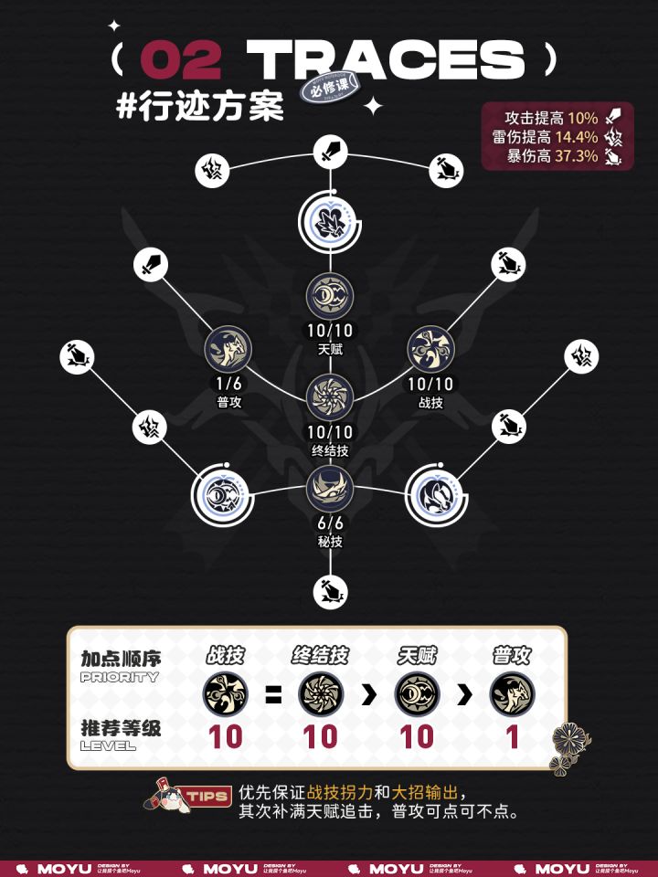 #献给破晓的失控 UID:100726351伴随着4.1版本的到来,新角色不死途也是上线了。作为五星雷属性巡猎角色,不死途主要靠追加攻击进行输出,同时还能给全队提供减防和追击暴伤的增益。下面就来讲讲不死途该如何培养。【技能简析和升级建议】推荐技能升级顺序:战技>终结技=天赋>普攻。战技升级可以提升减防幅度;终结技和天赋升级主要提升对应的(追击)伤害;普攻则可以不升。行迹方面,三个额外能力、以