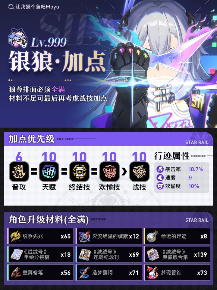 UID:104347362好耶,是周年庆,是狼尊!『银狼lv.999』的【技能加点&材料统计】全收集来噜~速速收藏准备起来吧!“V我材料,让你见识什么叫无敌玩家”—————— ฅ՞• •՞ฅ ———————【行迹升级部分】按照鱼酱推荐的方案展示:普攻 = 天赋 = 终结技 = 欢愉技 > 战技普攻6 / 天赋10 / 终结技10 / 欢愉技10 / 战技10(含所有额外行迹材料)