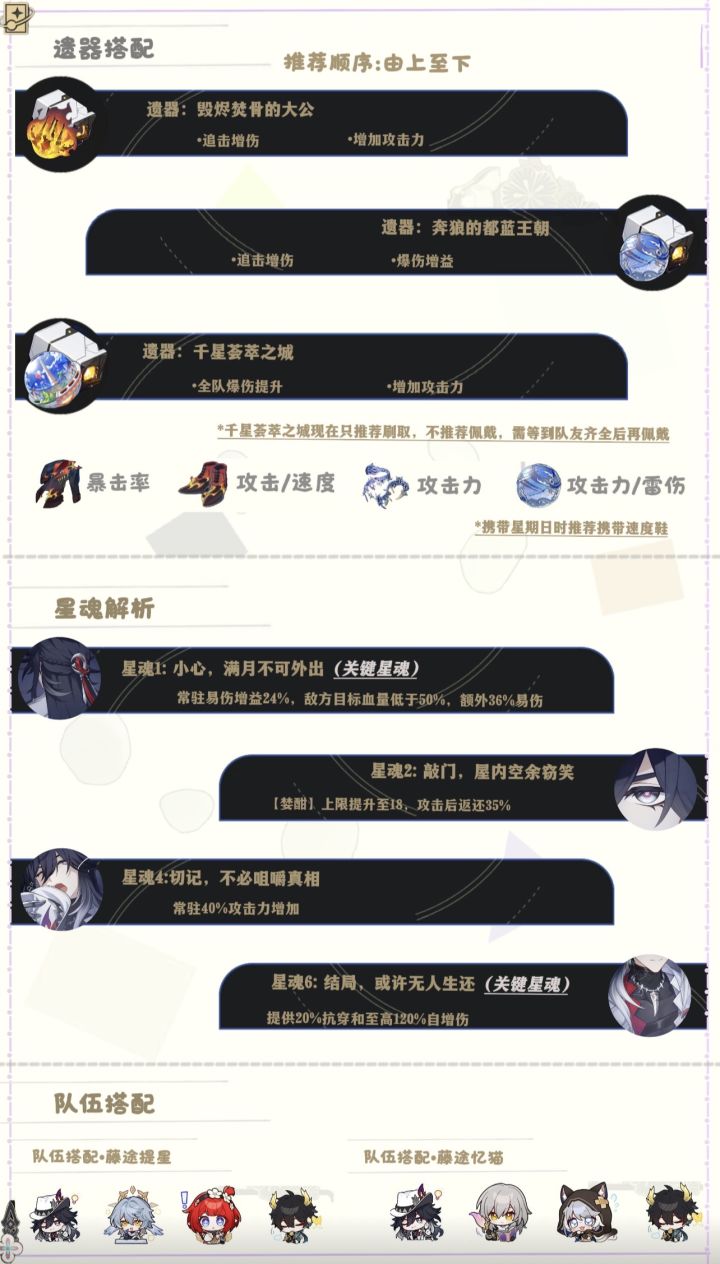 UID:113769211这里是赋赋!开拓者们好鸭~期待已久的“不死途”终于与我们见面啦!跟着赋赋一起来看看关于“他”的培养~【一句话介绍“不死途”】不死途是全新雷属性【巡猎】命途角色,这位不死神探侦探所的侦探先生拥有通过多次追加攻击高频行动、降低敌方防御力、提升我方单位暴击伤害、并额外提升追加攻击的暴击伤害,恢复自身能量、提升自身追加攻击伤害等多种能力。【正式介绍&机制概述】不死途