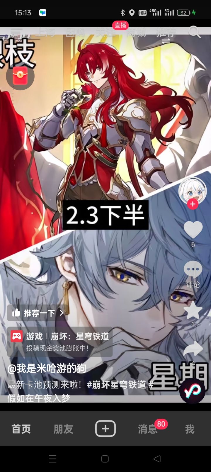 UID:100148671此次星穹铁道1周年都给大家带来了哪些惊喜呢?本期就让冻梨用一分钟,让大家快速知晓吧!300星琼(17号23.59分失效喔):QTGYNTKDLPQG、STGGPTJC4NQ4、ESHY7TKULPQQ一、卡池情报【上半】黄泉、罗刹、加拉赫、佩拉、丹恒;【下半】砂金、镜流、玲可、卢卡、希露瓦。此外还新增了全新4星存护光锥「两个人的演唱会」图中是小时候的星期日与知更鸟