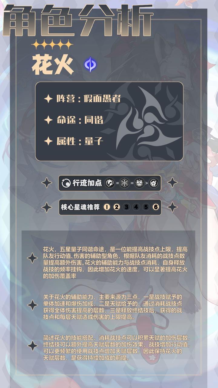UID:103872761一,角色简要花火,五星量子同谐命途,集增伤、拉条、回点为一体的辅助,通过大招给予的【迷诡】效果,可以使我方单位在消耗战绩点时,提高造成的伤害;战技可以提高我方单体的暴击伤害,且行动能力提前50%。因此,花火是一名需要频繁触发战技和终结技,来提高队伍伤害以及主C行动次数的辅助角色。普攻:对单体造成花火50%攻击力的量子属性伤害。战技:提高我方单体,基于花火24%的