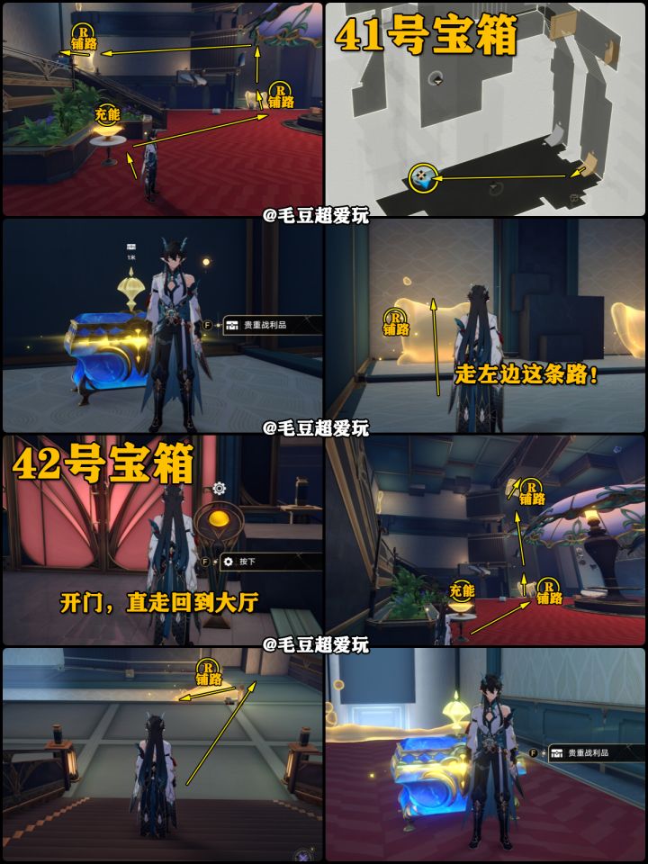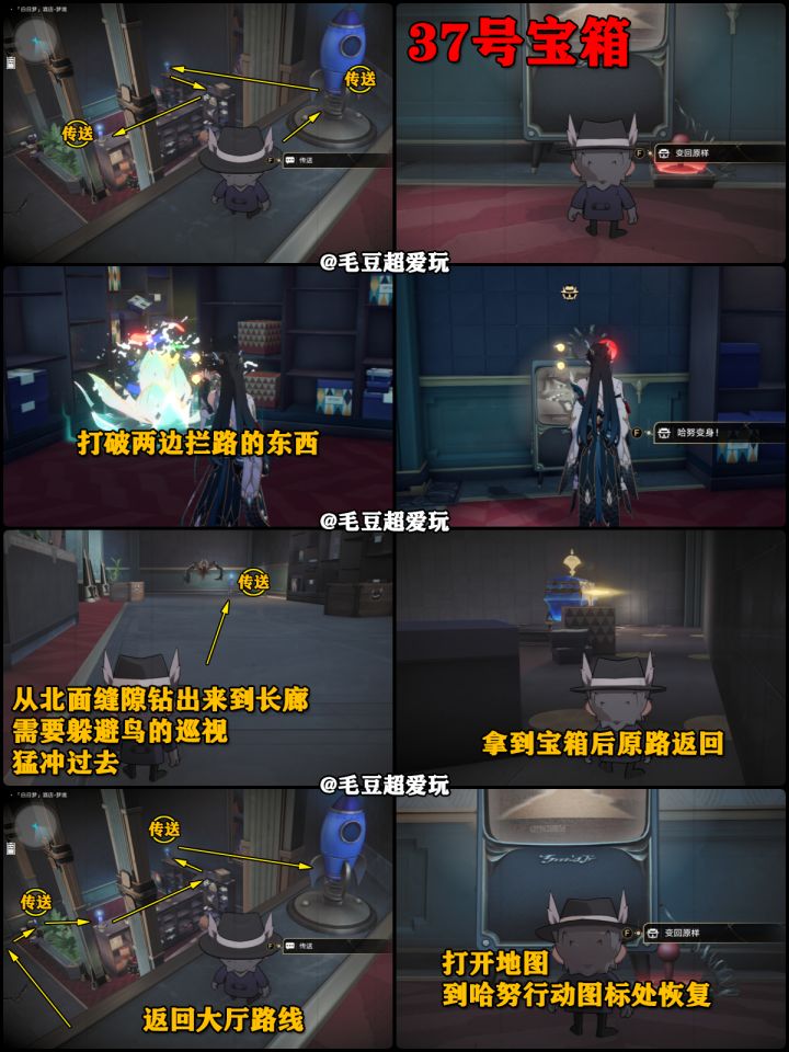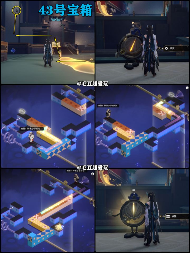 【崩坏:星穹铁道】UID:102444222这里是毛豆,本期毛豆整理了2.0版本新增地图匹诺康尼「白日梦」酒店-梦境的宝箱点位,本篇共计包含60个点位的全收集,希望能对各位开拓者有帮助。书接上回,中篇共计包含32-43号宝箱的收集路线,以及1个王下一桶+1个积木宝箱。积木宝箱任务需要回复短信才可提交道具,任务提交地点毛豆在图中做了标注,共需收集15个积木块,提交3次后出现宝箱。屠场12个