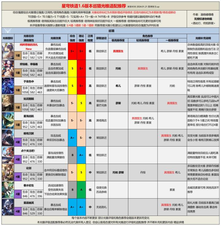 UID 100760002各位开拓者好,我是澈晓!星铁1.6下半版本实装了真理医生,并且可以免费获取,目前真理医生已经成为星铁持有率最高的限五角色。并且真理医生在免费获取的同时,还拥有比较可观的强度,因此很多不少开拓者也都会愿意为其抽取专属光锥「纯粹思维的洗礼」。除此之外,相信很多开拓者也在纠结应该如何为自己背包里的光锥分配使用角色。今天为大家带来的内容是1.6版本全光锥评级适配推荐,通过