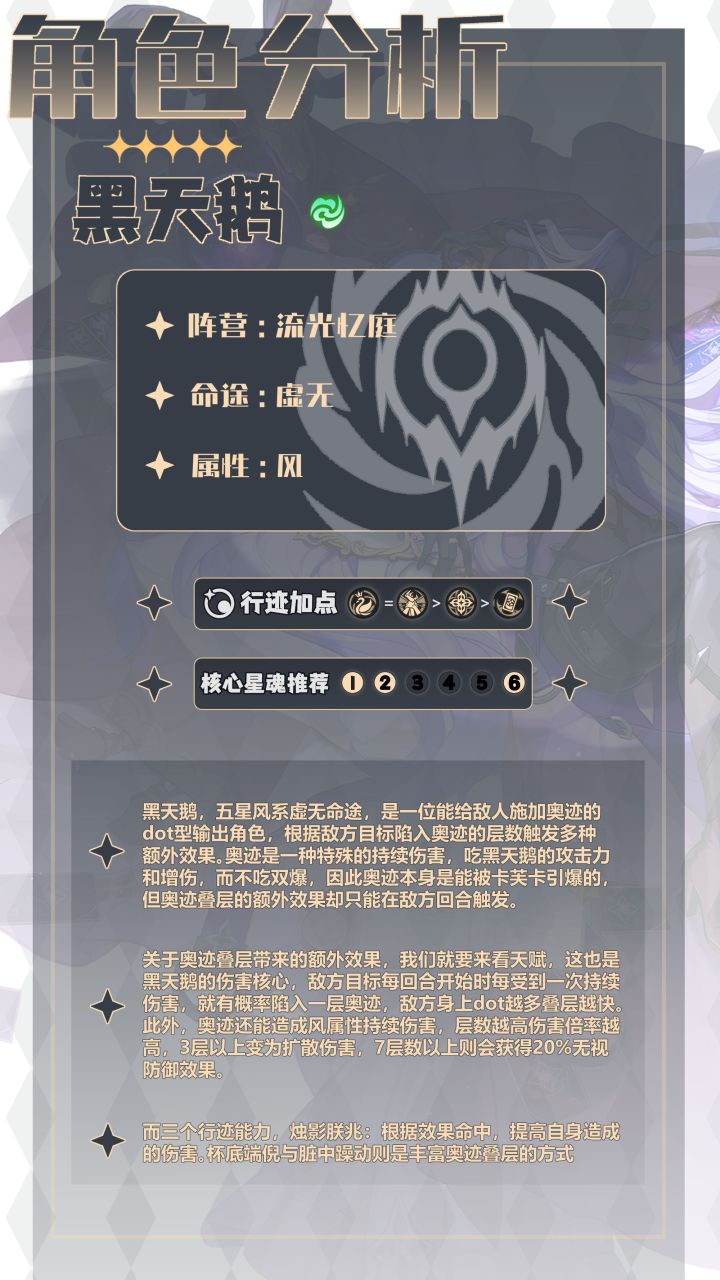 UID:103872761崩铁2.0黑天鹅攻略详解,风系虚无重铸DOT队荣光一、角色详情1,黑天鹅,五星风系虚无命途,是一位能给敌人施加奥迹的dot型输出角色,根据敌方目标陷入奥迹的层数触发多种额外效果。奥迹是一种特殊的持续伤害,吃黑天鹅的攻击力和增伤,而不吃双爆,因此奥迹本身是能被卡芙卡引爆的,但奥迹叠层的额外效果却只能在敌方回合触发。2,关于奥迹叠层带来的额外效果,我们就要来看天赋,这