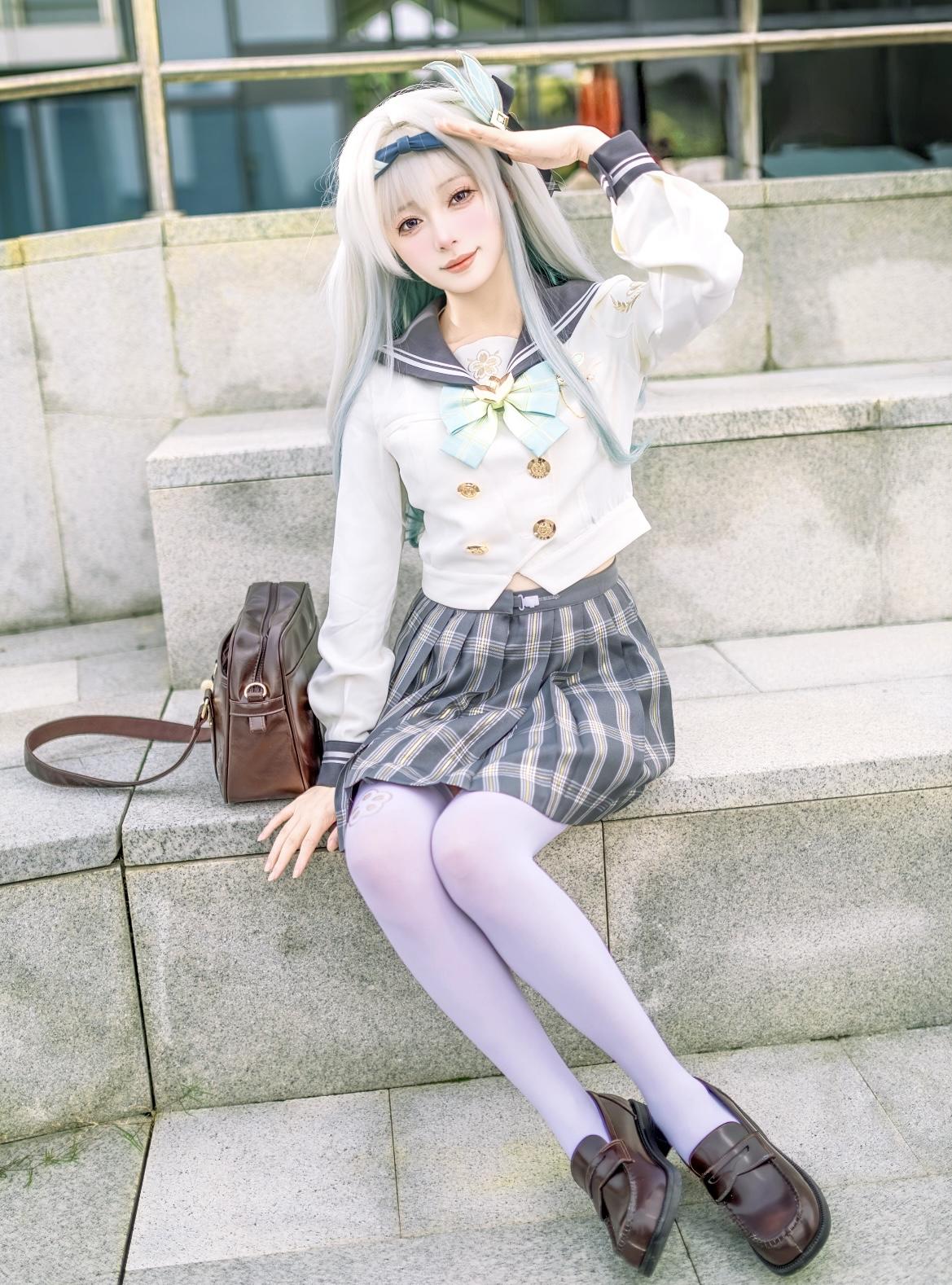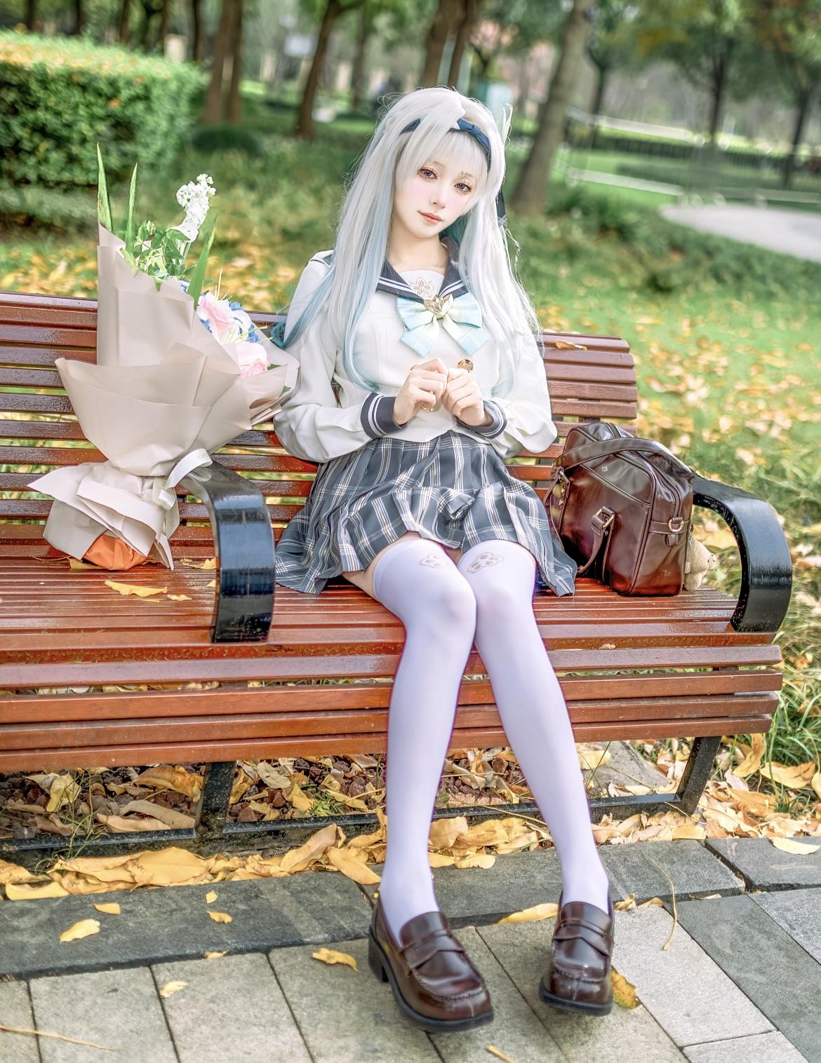 uid100512025这组cos返图宛如从日系校园动漫中截取的经典画面,氛围感与还原度双双拉满。秋日的公园中,落满黄叶的木质长椅成了绝佳的布景,背景里的绿植与落叶晕染出温柔的暖调,为画面奠定了清新又治愈的基调。出镜者的造型堪称神还原,银白的长发柔顺地披散肩头,发间的蓝色发饰点缀得恰到好处,与角色的发色完美呼应;水手服的版型剪裁合身,浅蓝的领结、格纹的百褶裙搭配纯白的长筒袜,将校园少女的清甜与青
