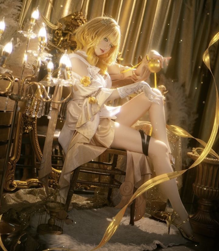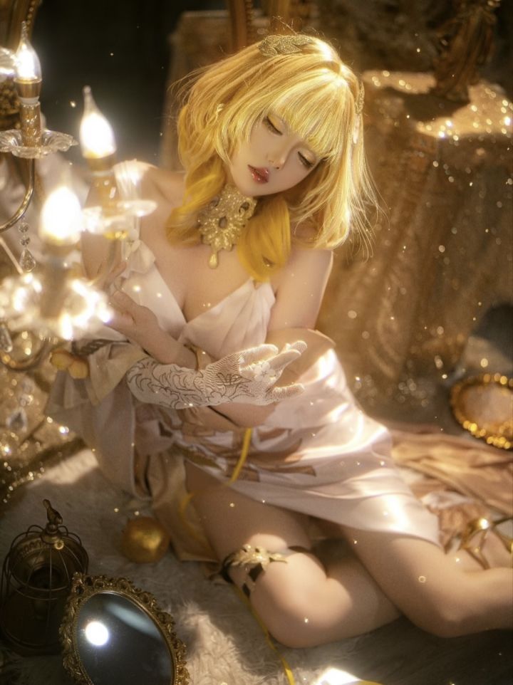 uid:100512025这组cos的氛围感直接封神!金棕渐变的卷发蓬松又有光泽,发间的精致发饰点缀得恰到好处,瞬间勾勒出角色的华贵气质。浅金与柔白交织的服饰设计绝美,缎面的光泽、花朵刺绣的细节,将优雅与柔美融合得淋漓尽致,露肩的剪裁又添了几分慵懒的魅惑。妆容的色调与整体造型完美呼应,唇色的淡粉衬得肌肤胜雪,低垂的眼眸带着朦胧的温柔,姿态慵懒地倚靠在鎏金布景中,光影洒在身上的瞬间,仿佛坠入了鎏金