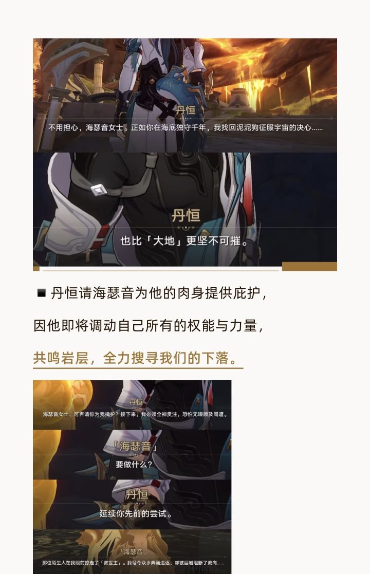 「以天地为横轴,以时光为纵轴,我将找到那唯一的点。哪怕要用我的双脚,遍历这山川大地每一处角落.·我都会带你回家!」为了拯救受困的伙伴,丹恒决定将自己融入翁法罗斯的命运。以此身为舟,他接过了「大地」的火种,获得与众生共鸣的能力。他与圣树共鸣,将自己的精神力随圣树的根脉注入大地。在火种的作用下,大地与他产生了共鸣。掷下的力量像一颗种子生根发芽。向翁法罗斯每个角落伸展。此刻他就