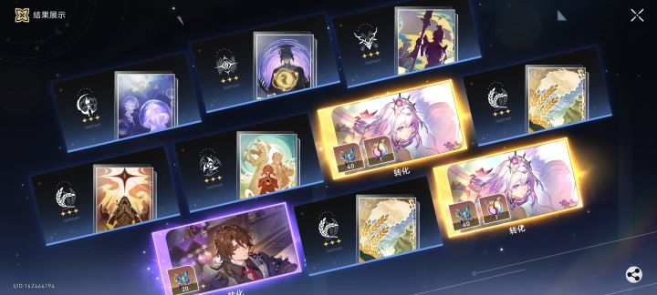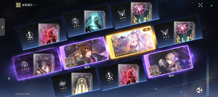 前两个都是小保底出的,第三次是20抽歪了布洛尼亚,又80抽出了两个,本来想2+1的,现在3+1了。专武30抽出的,第一次10连还出了个银河铁道之夜#崩坏星穹铁道2周年 #游戏日常 #游戏杂谈
