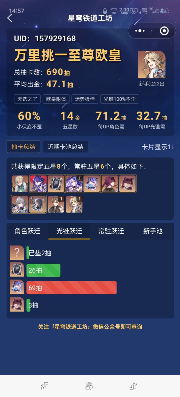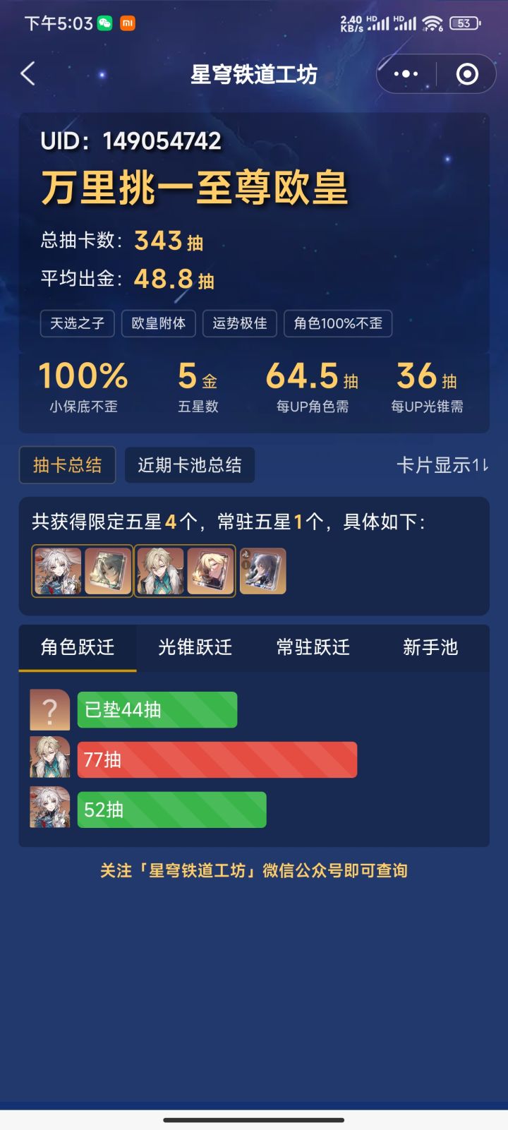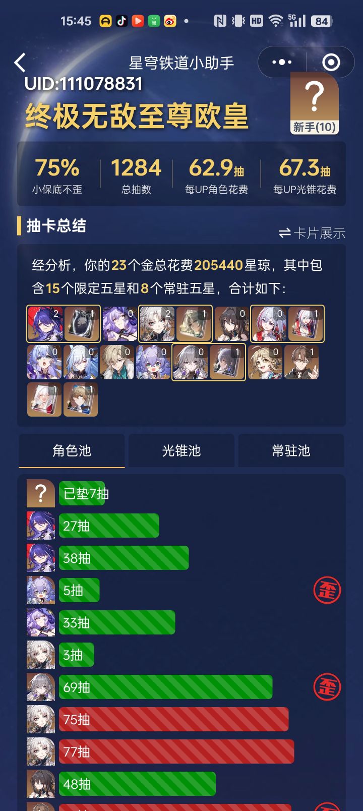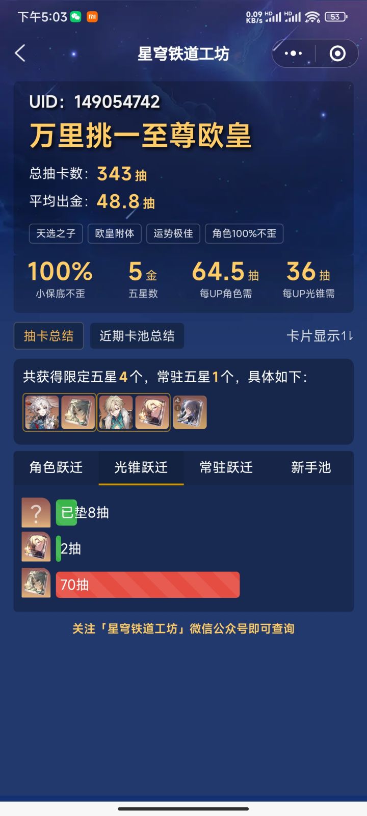 上辈子是拯救了银河系么?这么欧???#崩坏星穹铁道 15张专票,7059星琼。第1发10连角色池直接出金,0+0砂金(当时想的是5张专票图个整,普票只有8张,把砂金升到了80级,拿了三张)第2发10连常驻池直接出金,鸭鸭专武(看了下保底)兑换了5张专票。第3发10连武器池直接出金,0+1砂金