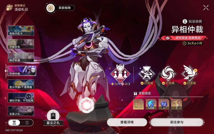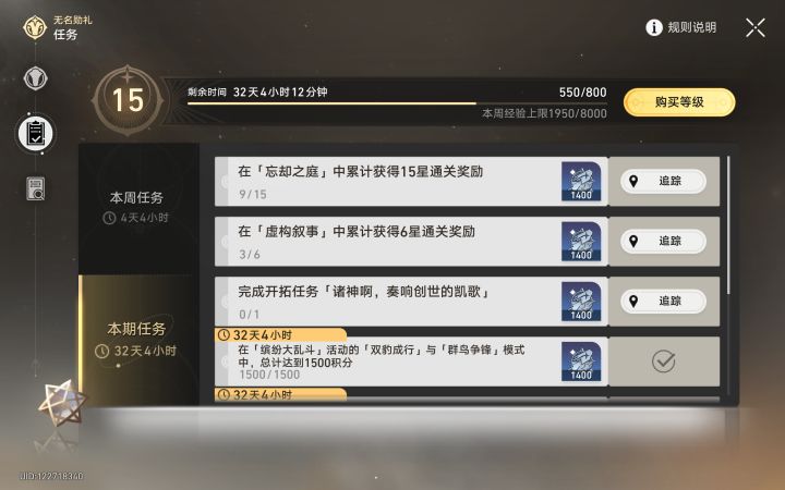如图一,较高难度的三个挑战全部已完成如图二,无名勋礼的任务奖励确实不让领(纯bug反馈,不存在整活倾向)os:我说我说怎么这次勋礼我升的这么慢呢
