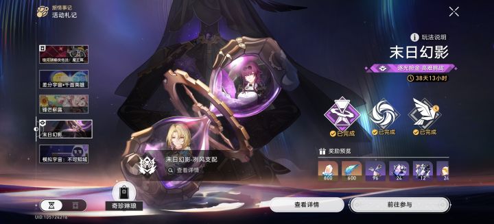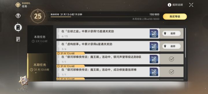 如图,当忘却之庭、虚构叙事、混沌回忆使用直接通关最后一关的方式直接领取奖励时,无名勋礼任务不能结算其通关的星数。希望能够优化一下。#崩坏星穹铁道