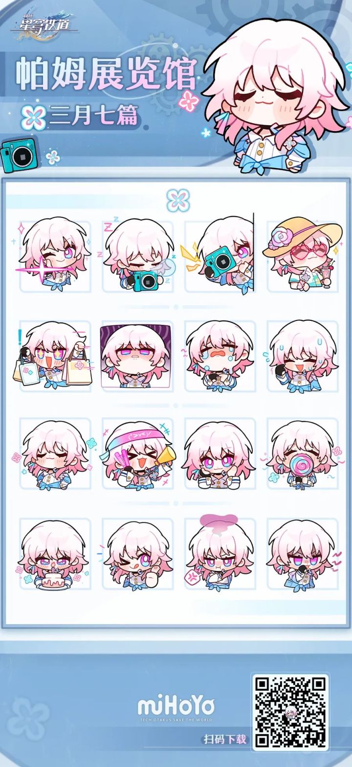 《崩坏:星穹铁道》表情包「帕姆展览馆第1弹」三月七篇现已上线,欢迎各位开拓者前往微信平台下载使用~▉表情包获取方式:★搜索「崩坏星穹铁道」官方微信公众号,查看「帕姆展览馆」相关推送。★保存下方图片,使用微信“扫一扫”功能扫描图内二维码,即可跳转相应表情商店页面。