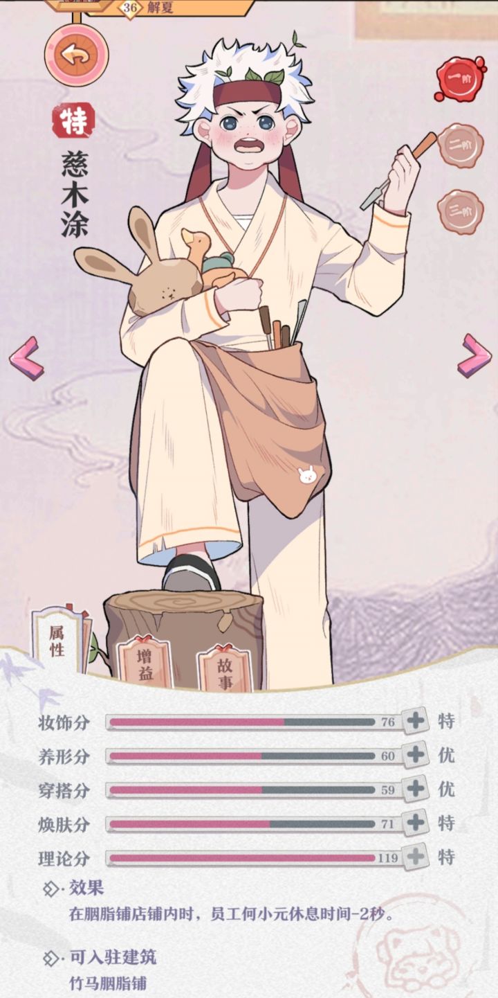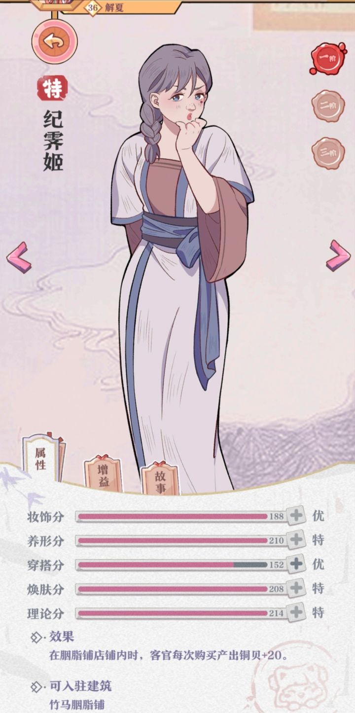#竹马胭脂铺攻略 小人基本以头发眼睛的颜色为准,一二三阶会有不同所有产出前提:已解锁建筑珍古阁/活动高价值兑换物(进店20次)图1周梓芸,雕竹墨图2谢长雪,弯月刀图3闵含紫,药瓶图4柳茵茵,圆扇图5 王戒,雕竹墨图6浦承荆,药瓶图7苏若蓝,圆扇